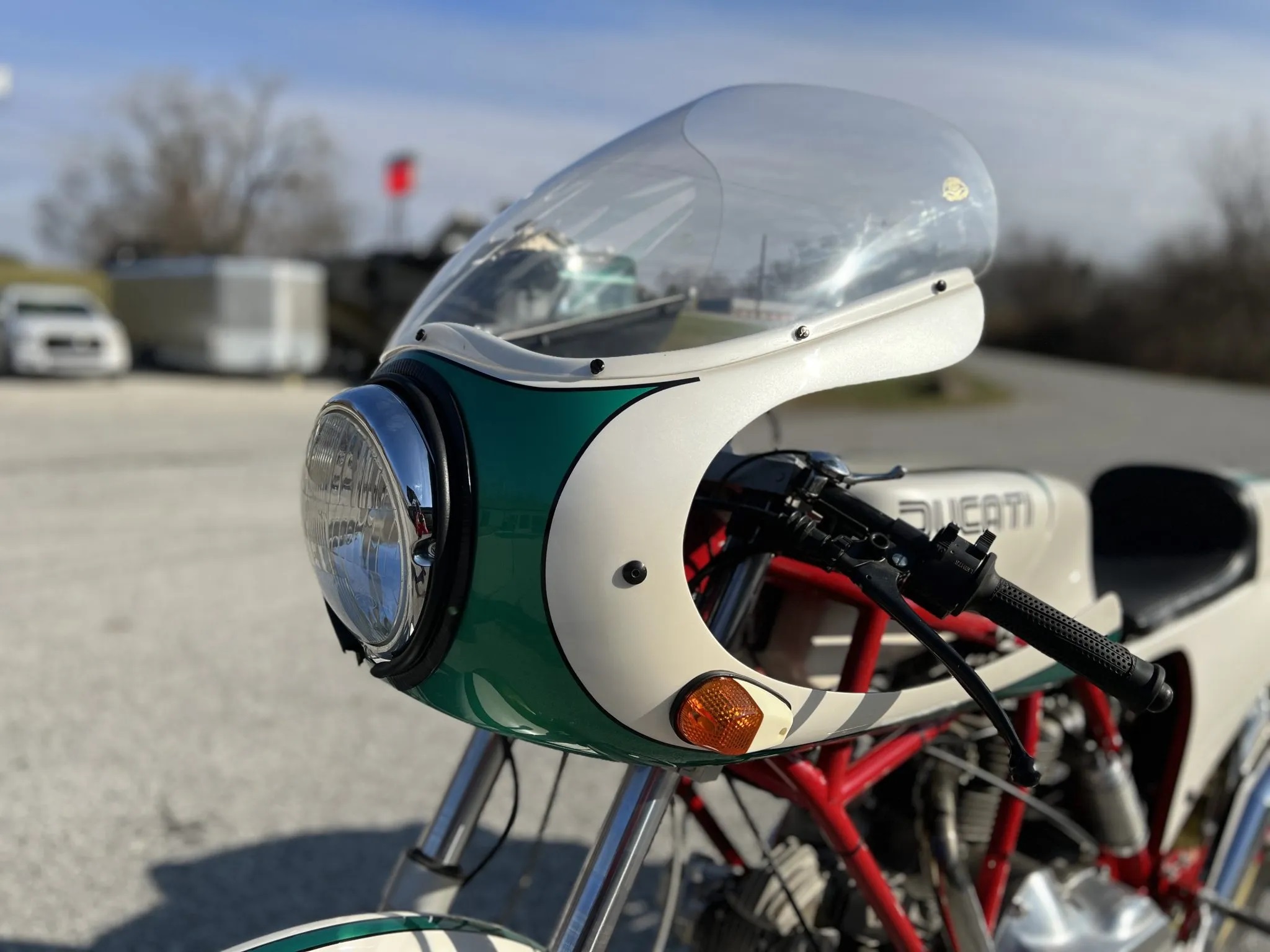 In the 1990s, this 1977 Ducati 900 was modified using a C&J Precision Products frame and Fiber Systems fiberglass bodywork. The pearl white and green metallic finish, adorned with black pinstriping, graces the fiberglass body mounted on a C&J Precision Products’ red 4130 chrome-moly tube-frame. Notable features include a center stand, a wrap-around half fairing, a clear windscreen, street lighting, and a racing-style solo seat.