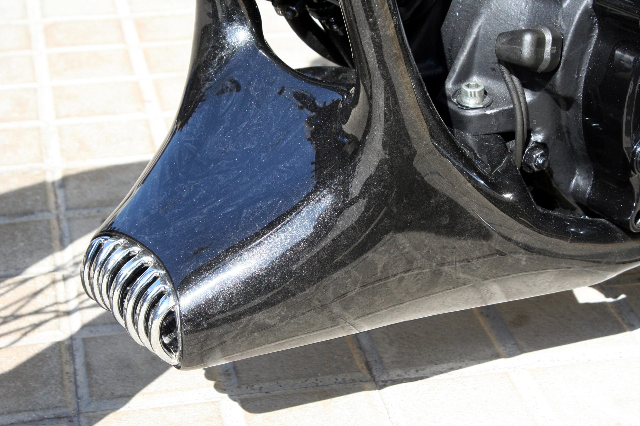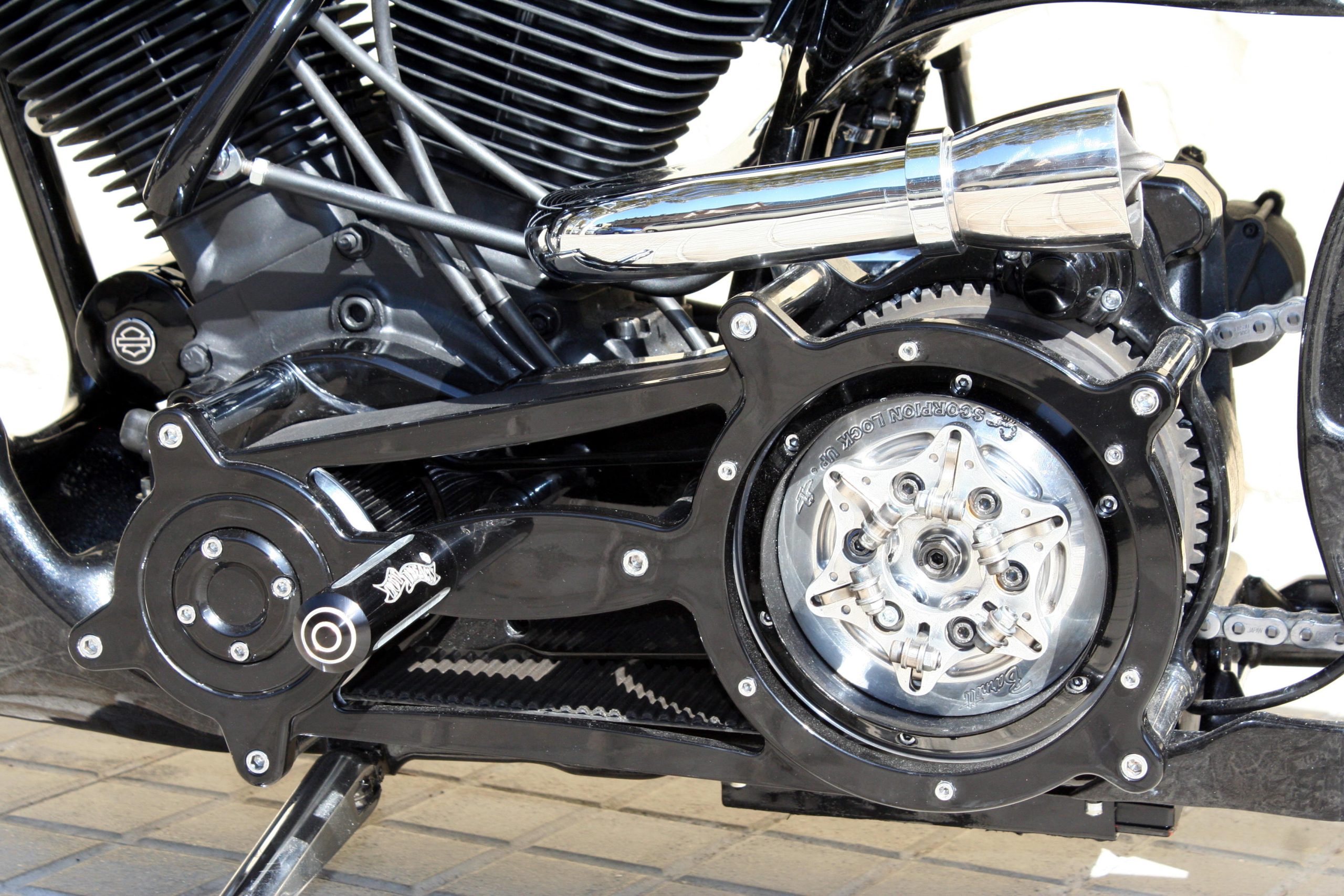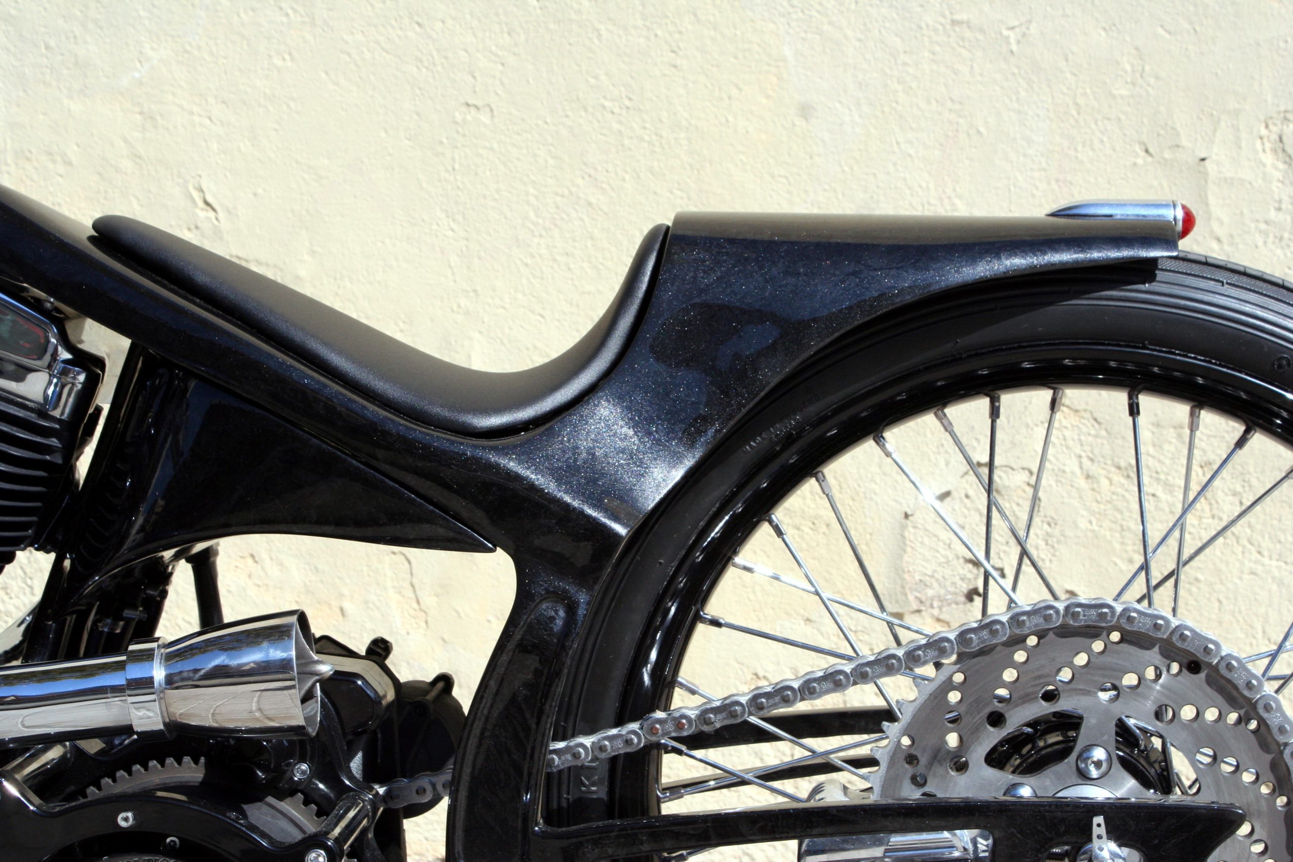 Ferry personally rebuilt and customized both the engine and gearbox in his workshop. The primary drive boasts a modified Barnett Scorpion with a 3″ belt and lock-up clutch. The wheels, 21×2.25″ at both ends, are stock Harley-Davidson, and the combined rear brake/sprocket is a Kustom Tech item with a 2-pot caliper. The motorcycle incorporates various handmade elements, including the fuel tank, oil tank, rear mudguard, seat and bodywork, hand gearshift, upper engine mount, exhausts, and more.