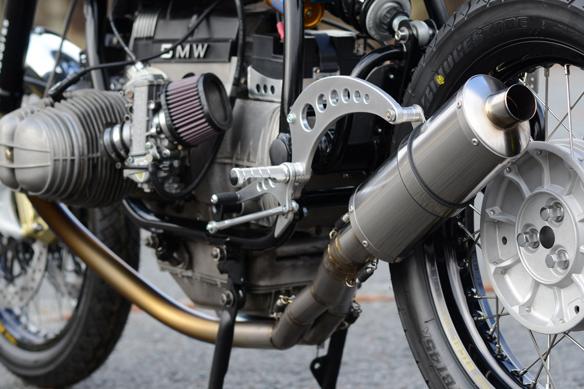 The bikes 980cc Boxer engine remains relatively untouched as the bike was destined to be an everyday rider. So, aside from a customary service and tune, the only tweaks are to its fuelling and exhaust. Shiro has replaced the stock carbs with a pair of KEIHIN FCR wearing K&N filters. The exhaust is a striking titanium 2-into-1 system that Shiro painstakingly bent to shape by hand. The muffler is also a custom item made from scratch using more titanium. While the engine was out of the way Shiro also invested some time into reinforcing the frame to stiffen up the bikes handling.