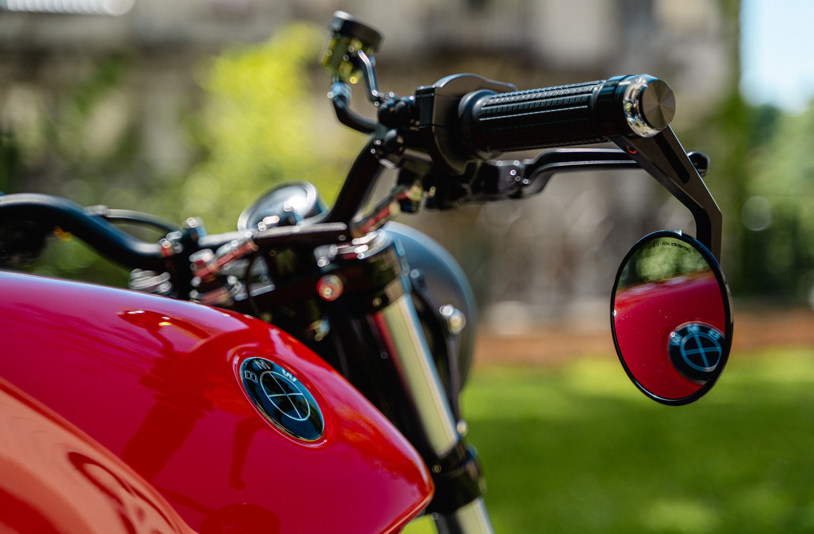 The BMW’s frame has also undergone some changes. For the first time, Marcel opted for a stepped subframe design. This has resulted in a unique, modern silhouette for the 40-year-old donor. The frame was machined, modified at the back, and finished in fresh black powder coat. The engine, painted black to match, sits beneath the stock fuel tank which has been treated to an Audi Tango Red scheme that pops against the all-black chassis.