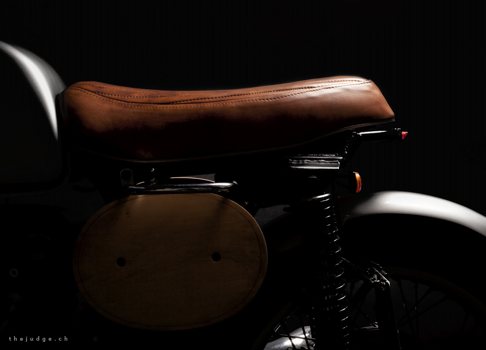 “We had no obligations with this build. No Cafe Racer or Street Tracker template to follow. We proposed the idea of building a “James Bond” motorcycle reminiscent of his Aston Martin and seductive in its styling. We designed parts that we felt would appeal to women and perhaps even seduce them with its fine details and pleasantries. The passenger pegs for instance, feature laser etched wood inserts with “s’il vous plaît..” (please) engraved in to them.“…What else would one expect from a pair of Frenchmen!?