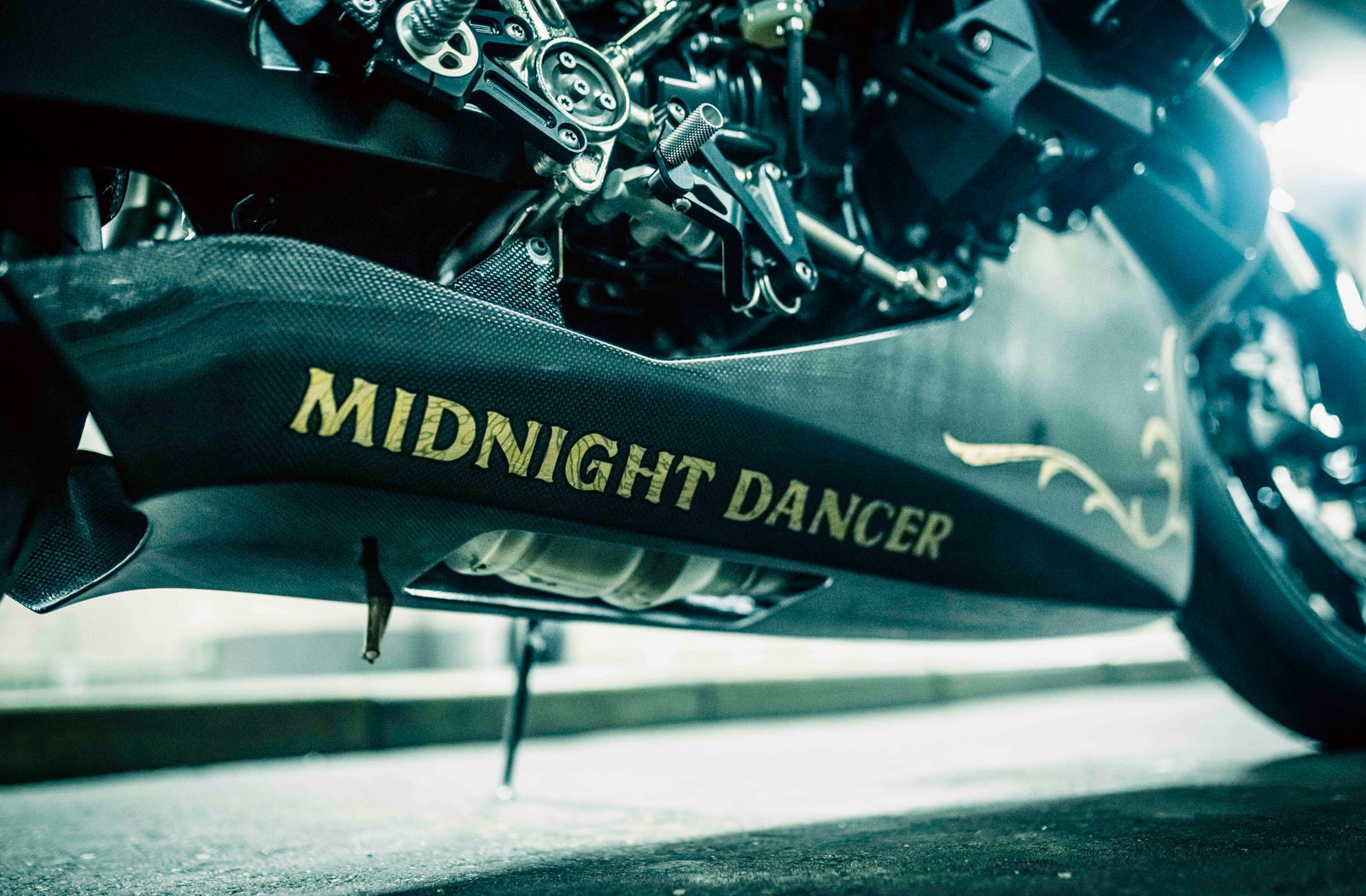I was originally going to finish even the rear cowl in carbon. But during the production process, I started to think that I wanted to combine metal with carbon. Even nowadays, racing bikes like MotoGP or WSBK sometimes use aluminium fuel tanks. In the off-season, when no sponsor or body colour has been decided, the teams test their bikes with bare aluminium tanks and carbon fibre cowls. That look is what I wanted to express with the Midnight Dancer.”