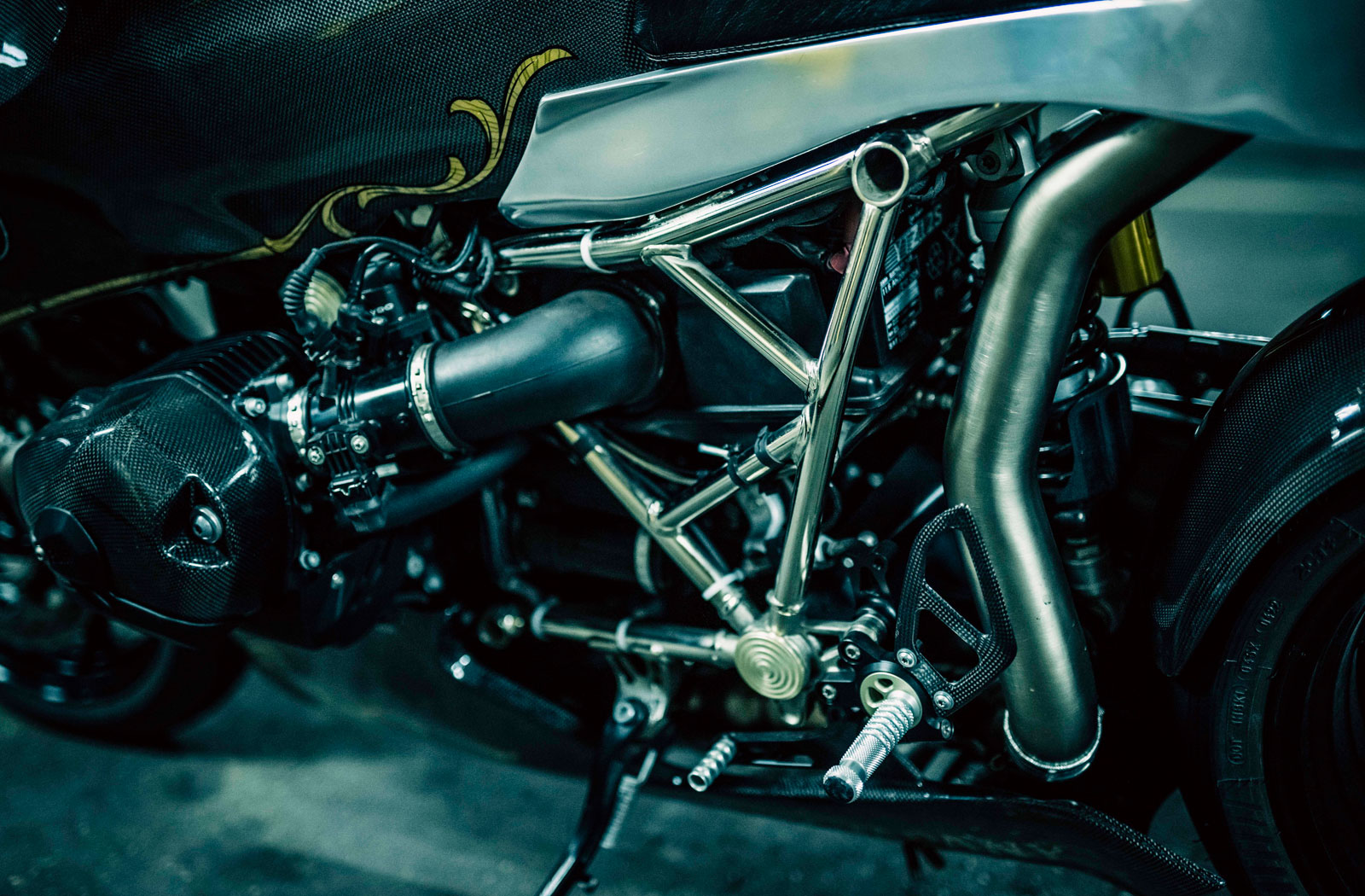Once my own Vacuum Infusion Technology had been established, my work moved on to design. The Midnight Dancer’s design is based on World Grand Prix racers from the 1980s. The era was characterized by large cowls and somewhat exaggerated designs compared to today’s race bikes. However, I loved the WGP in that era and have used that image many times in my custom motorcycles. This time, I tried to make it work with a BMW flat twin engine.”