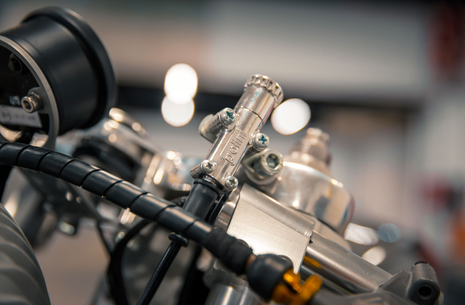 Marco began this project with the customary frame modifications. His work focused on the rear where he’s mounted a completely revised subframe to house the aforementioned Brat style saddle. During the overhaul, he also removed redundant brackets and resprayed the entire chassis in metallic silver.