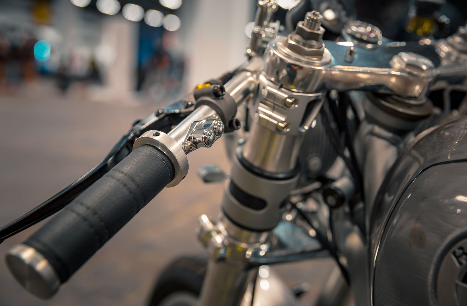 Next was the suspension which has also seen a complete overhaul. In the rear, you’ll find a modern YSS monoshock that sits between a custom mount on the subframe and the bike’s polished paralever shaft drive. Moving his attention to the front end Marco opted for a complete swap. Replacing the standard R100 R forks is a set from a Suzuki GSXR 750. The new setup sits in modified triple clamps which have also been diligently polished.