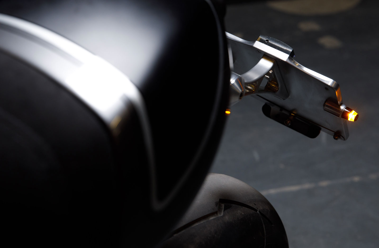 The remainder of the modifications are predominantly premium aftermarket add-ons. Sitting within the aluminium tail is a lightweight lithium battery. You’ll also find an LED tail light built into the design and Motogadget M.Blaze Pin indicators on the license plate holder. Sitting alongside the battery is a Motogadget M.unit which manages electrical duties.