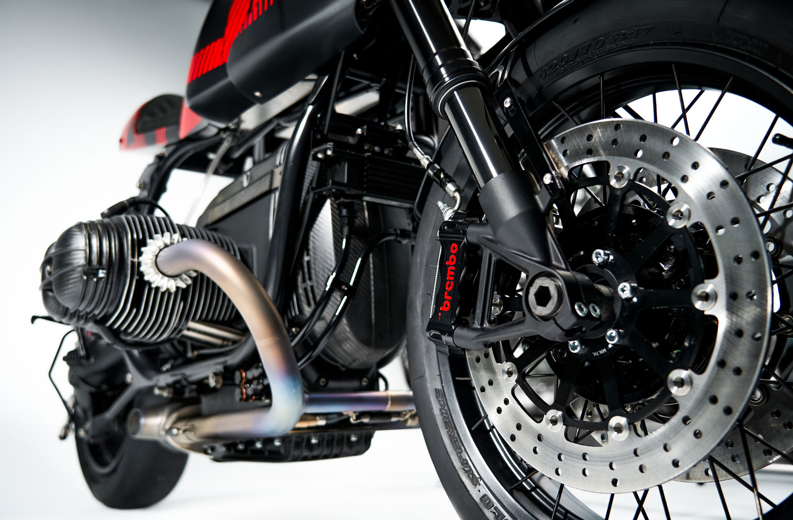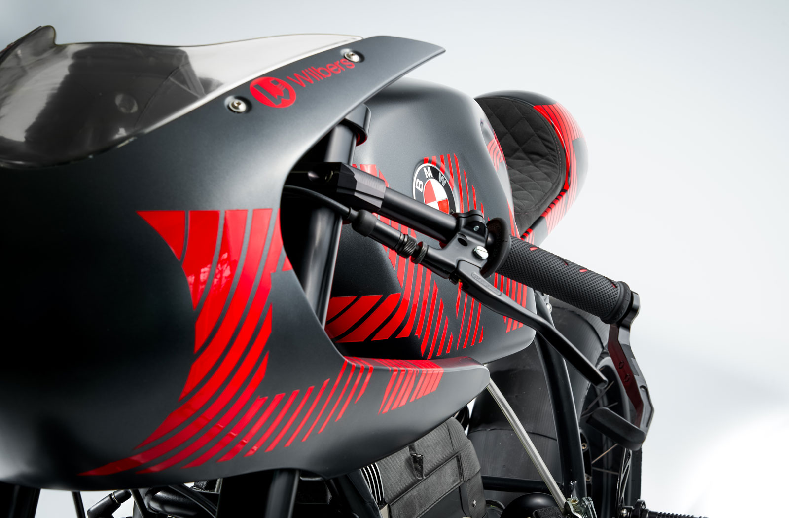Completing the look is a custom paint scheme that embodies their client’s brief. Laid over a metallic titanium ash grey base coat is hand-painted signal red livery consisting of the bike’s name and a race-style shopping list of brands whose products feature on the build. An Alcantara seat with diamond-pattern stitching provides a comfortable perch for the rider and a spattering of carbon fiber components adds an aggressive edge while shedding some unwanted pounds.
