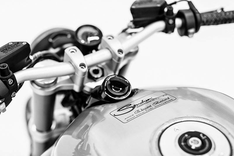 The aluminium fuel tank was hand made using wooden jigs in the Smokin workshop while the redesigned sub frame is a CNC milled piece that integrates the bikes rearward facing lights. The original tank badges have been relocated to the sides of the bike where they are fixed to carbon fibre engine covers and a pod filter sits on the mouth of the bikes ram air inlet.
