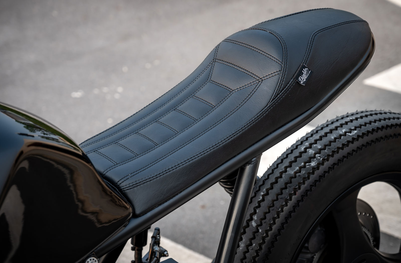 To help keep the rear end ultra-clean the brake light has been moved to the swingarm and the tiny LED turn signals sit low on either side of the rear wheel. The black leather seat recreates the look of a hard rear cowl. The new seat bears Diablo branding which is K-Speed’s own line of aftermarket parts. There are, of course, plenty of other examples from their catalogue here too.