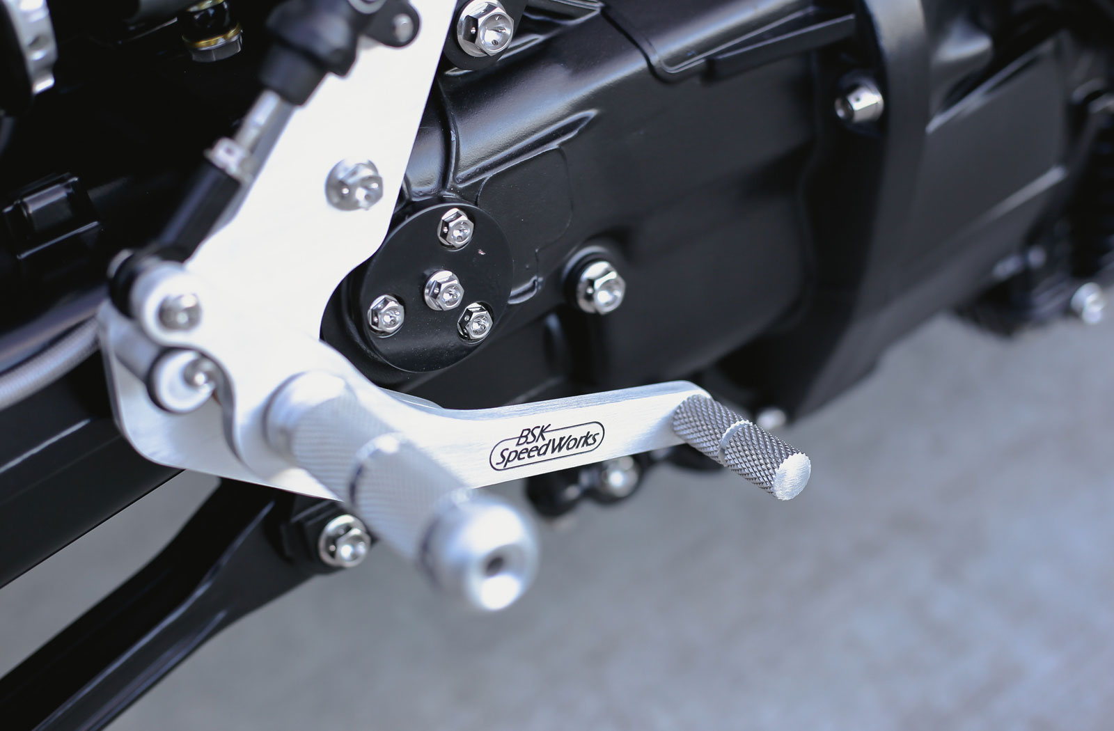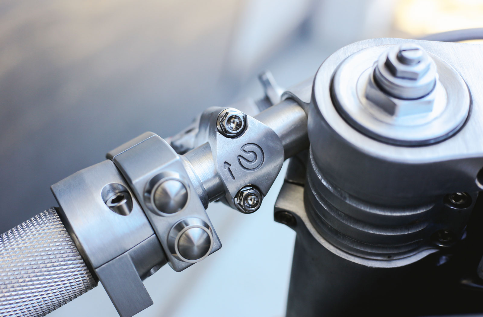 At the pointy end of the bike, you’ll find a Triumph Speed Triple wheel held in place by custom spacers. The forks are of Suzuki GSXR 1000 pedigree and are sitting in a custom triple clamp. They also came equipped with brake hardware by Brembo. In the rear is a BMW K1200 rear wheel with more Brembo gear. Alloy clip-on handlebars hang off the fork stanchions and they wear silver Motogadget m.button switches, stripped and sanded Brembo levers and knurled alloy grips. Sitting atop the modified clamp is a trick looking Scotts/Ohlins steering damper and a Motogadget Motoscope digital gauge. The gauge sits in a custom made aluminium housing and alloy BSK rear sets complete the revised riding position.