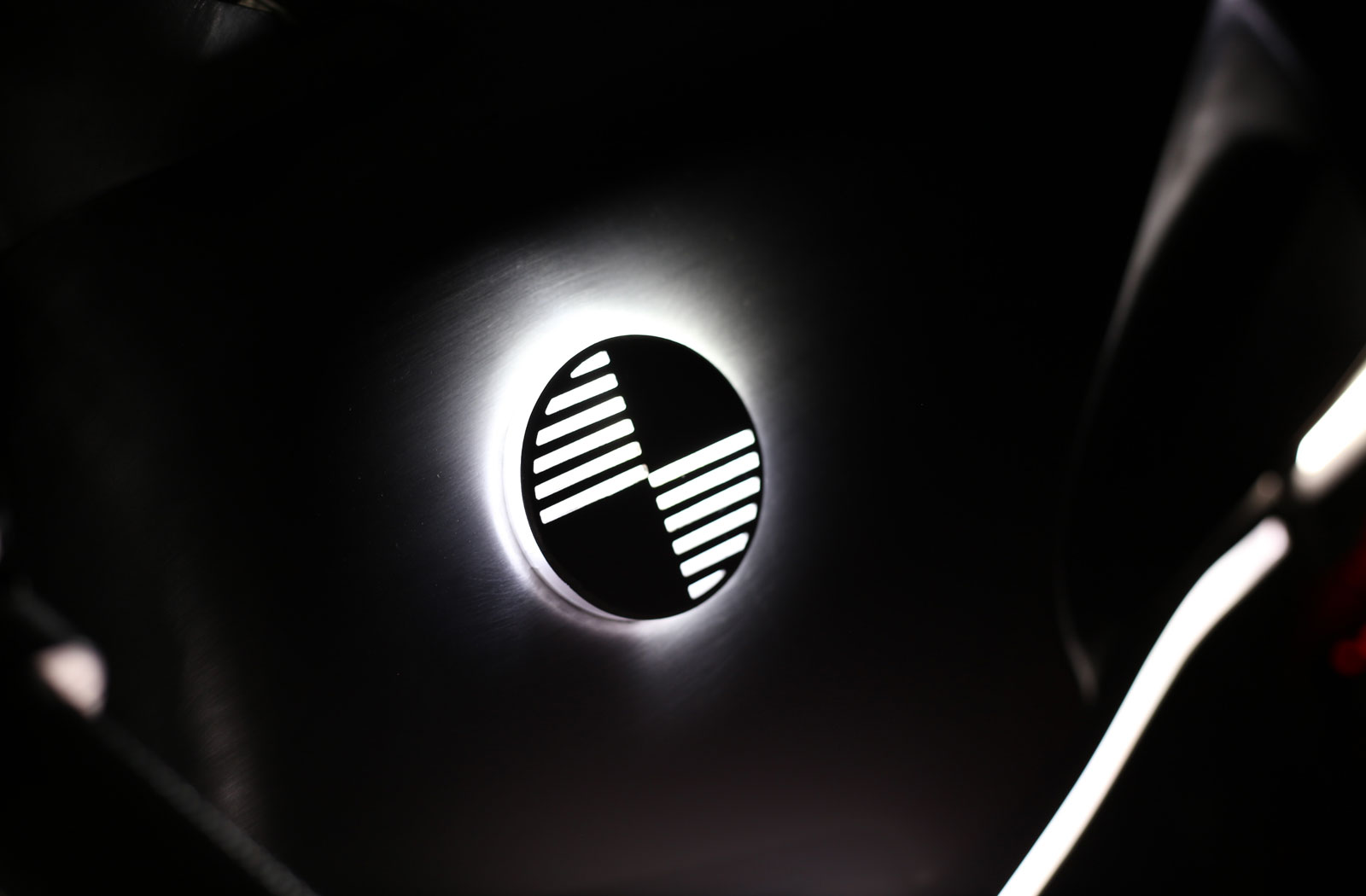 There is, of course, a lot more to this build than just the LED lighting effects. To house all of the acrylic details Mitch had to fabricate all-new bodywork. Using aluminium sheet he shaped his own fork covers, headlight cowl, side panels for beneath the tank, seat pan and a tail unit with integrated lighting. The list doesn’t end there though. Mitch machined his own BMW roundels and mounted them by modifying the tank so the wiring could be hidden. There’s also a custom choke pull, injection cover, coolant reservoir with a built-in sight glass, radiator caps, battery/electronics tray, and a billet subframe of his own design all machined from aluminium. Oh, and we better not forget the custom fuel cap, shock reservoir and velocity stacks which he’s mounted on an angle to match the lines of the fuel tank.
