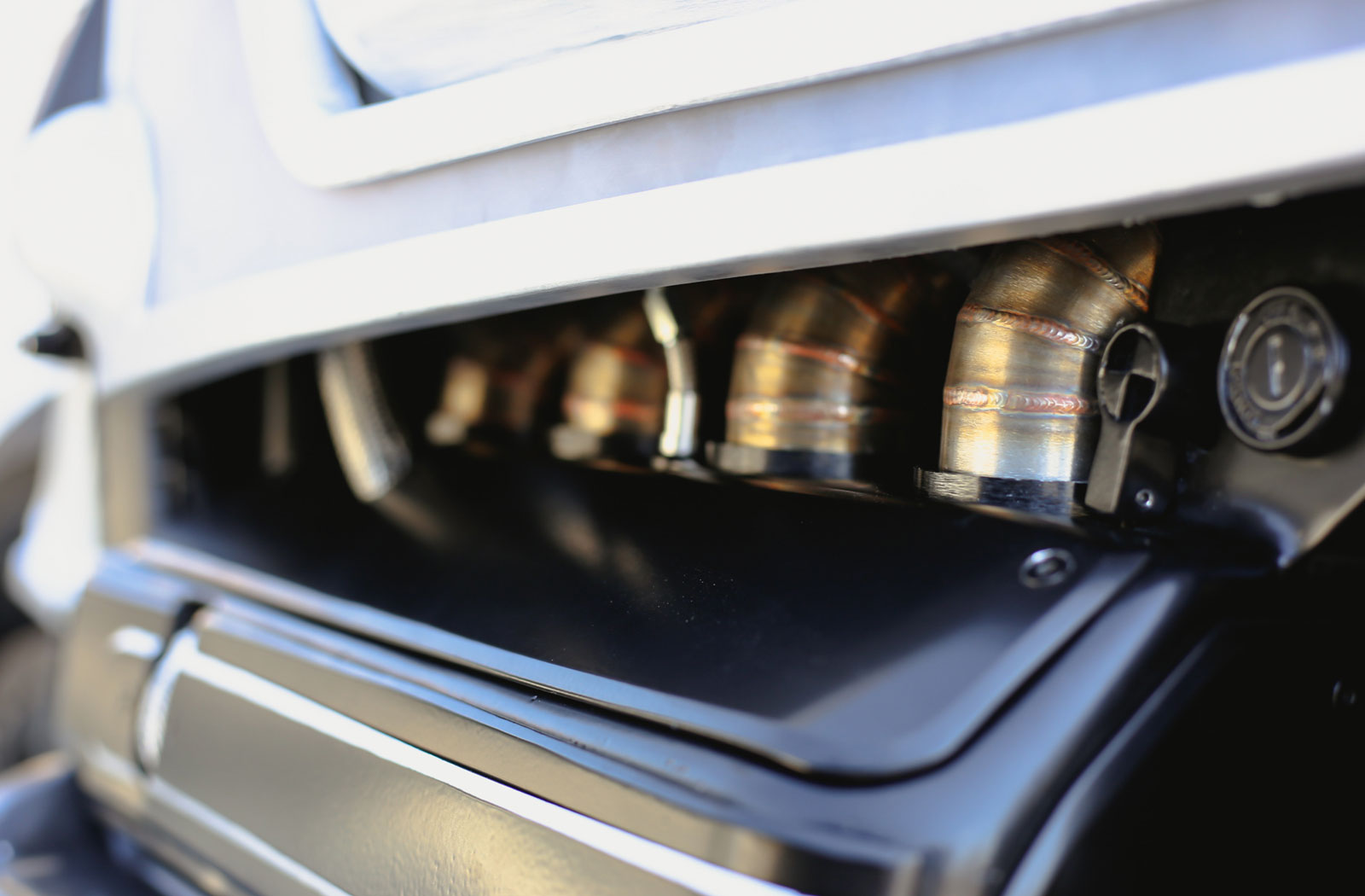 Mitch’s new setup is a 4-into-2 system with an x-pipe to balance them out. The whole system is an absolute work which is made even better by how he’s tucked the mufflers up into channels underneath the tail unit.