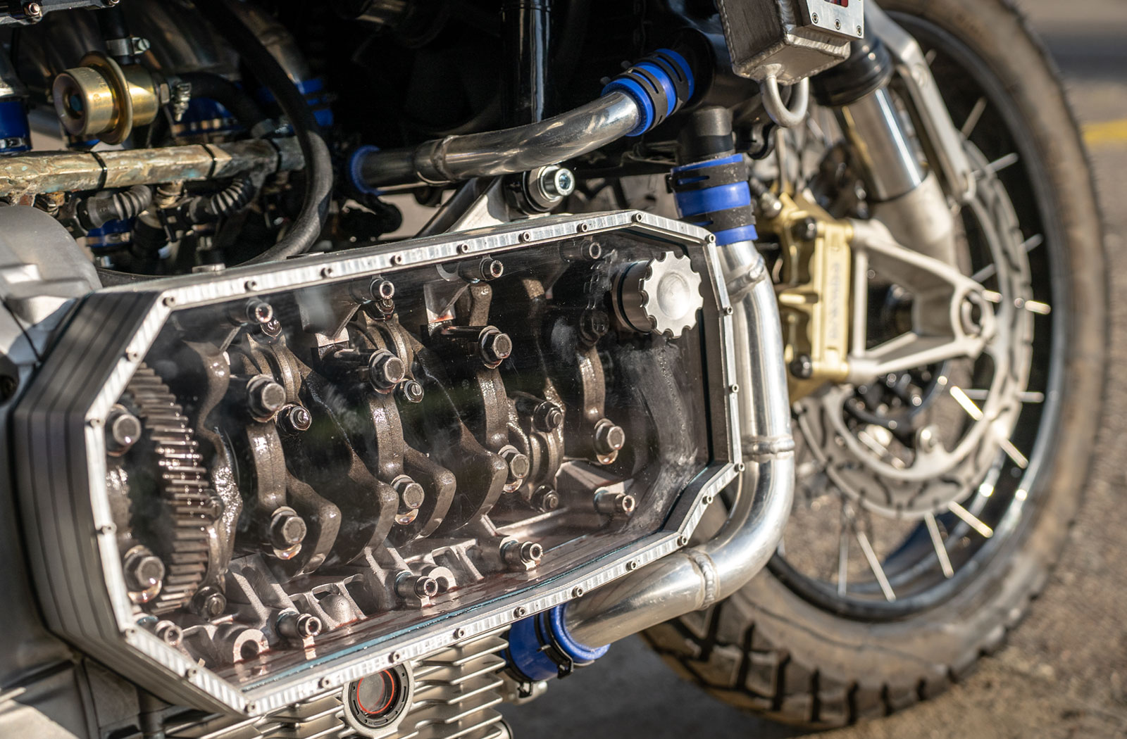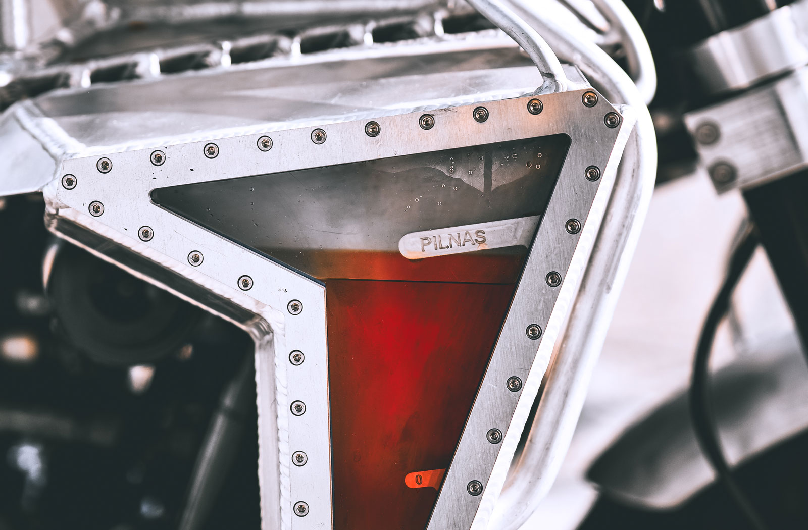 Although everything on this bike could be described as eye-catching, it’s the engine covers that have us double and triple-taking. “The casing between the gearbox and the engine has been cut out for the starter and alternator so it’s more open.” Vytautas points out. “The new covers have been built to give a clear view of the internals. It’s not often you get to see a crankshaft and valves in action!”