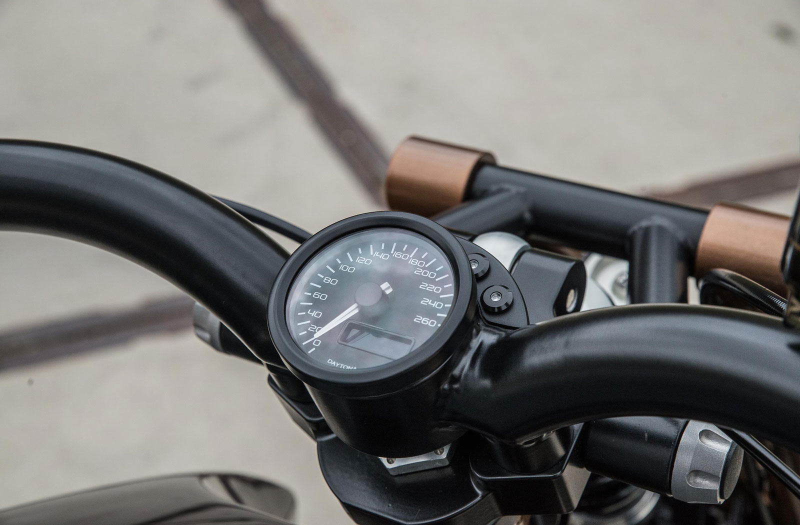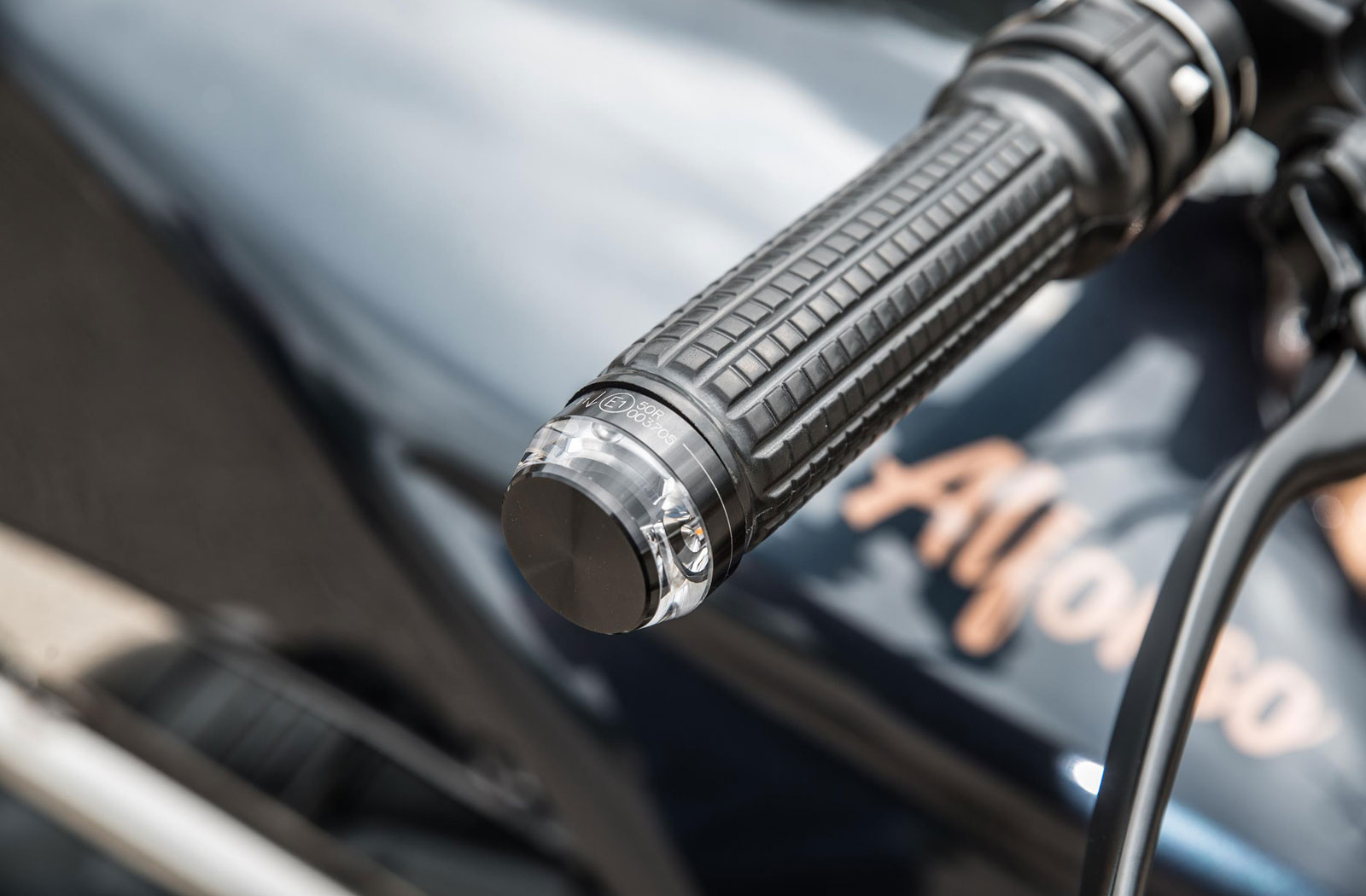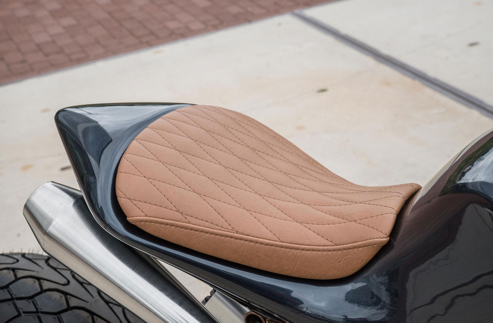 Topping the long list of custom-made accessories on this build is the one-off handlebar. Wido designed the swept-back bars himself, adding a housing for an aftermarket speedometer into it. The exhaust is another one-off design that Wido handcrafted from 304L stainless steel, right down to the 40mm bends and mufflers. The controls and electronics are all Motogadget accessories as are the bar end indicators and dual-function LEDs on the hugger-style license plate assembly.