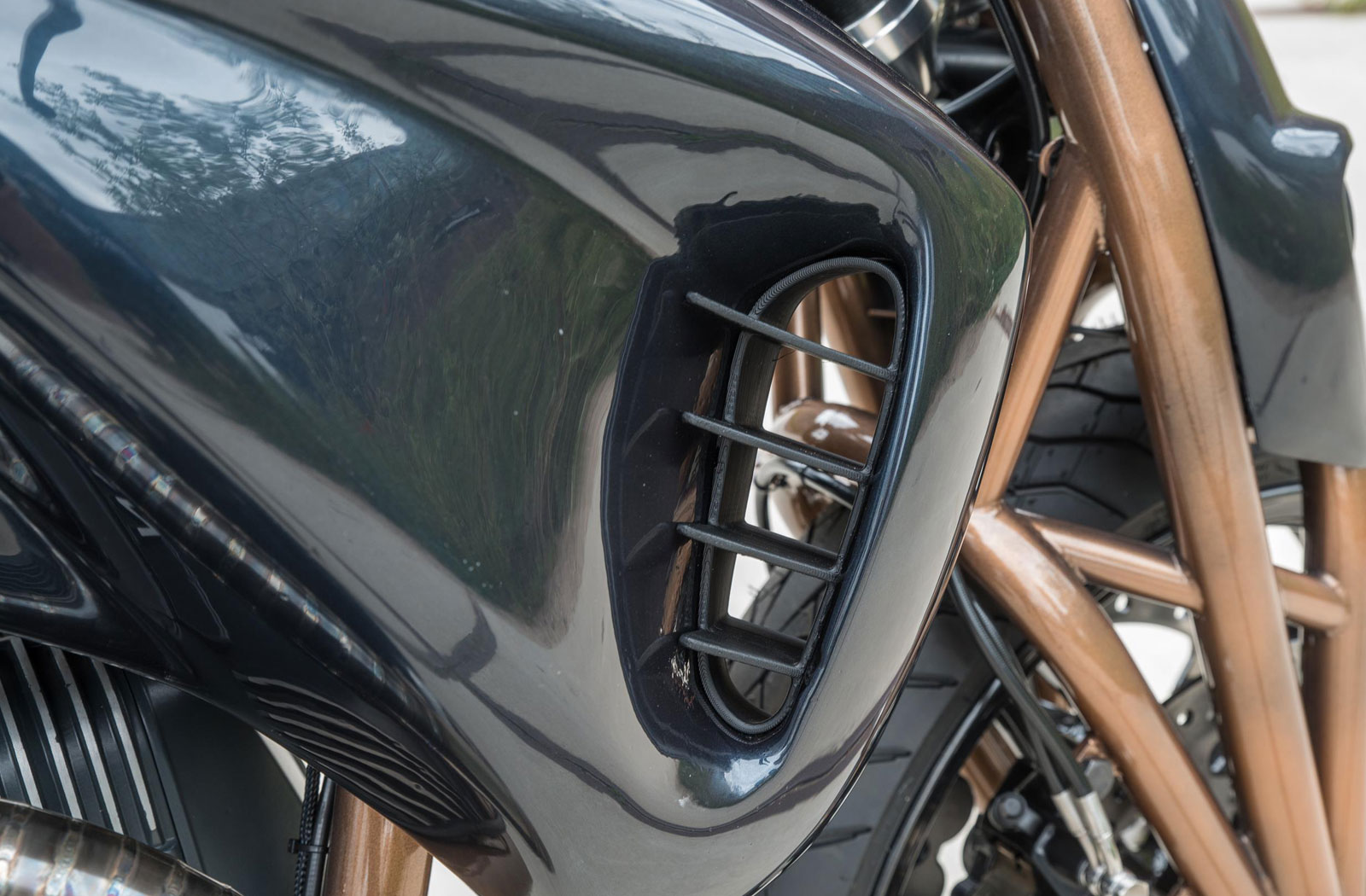 To create the bike’s bespoke bodywork Wido utilized XPS foam sheets. Several sheets were glued together and then painstakingly sanded by hand to create the new monocoque-style fuel tank and tail unit. “It really felt like sculpting,” he recalls. Once happy with the look, he created complex molds in order to be able to remove the final cast pieces. As for the aggressive-looking front fairings that house the twin headlamps, he shaped one side, scanned it in 3D, mirrored the design, and used a CNC machine to finish the job. The bike’s air intakes followed a similar process, combining 3D scanning and printing to integrate seamlessly into the main body.