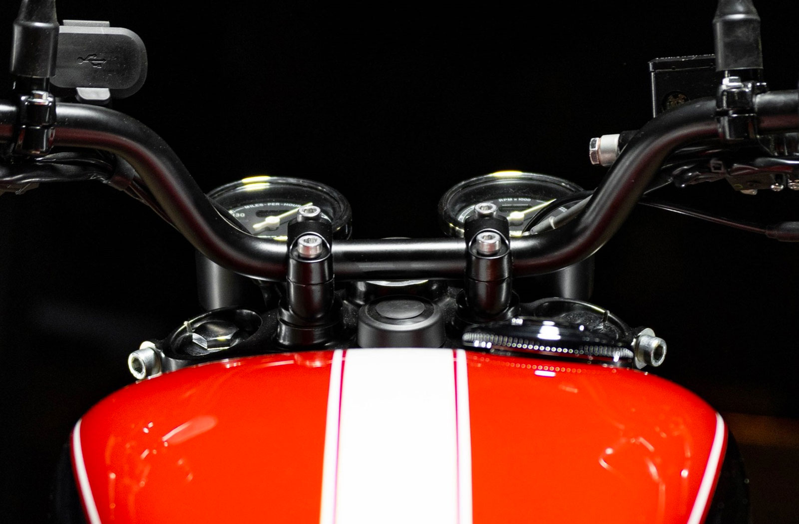The Gold Star 650 engine is suspended in a dual cradle, tubular steel frame. Conventional 41mm forks support the front end while the rear sits on twin, preload-adjustable shocks. The spoked alloy wheels are an 18/17 inch combo and will come wrapped in Pirelli Sportscomp rubber. Braking is provided by a single disc front and rear and Brembo callipers. ABS comes as standard but that’s the limit of the electronic performance enhancements you’ll find here.