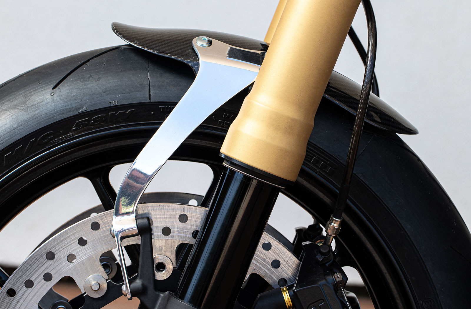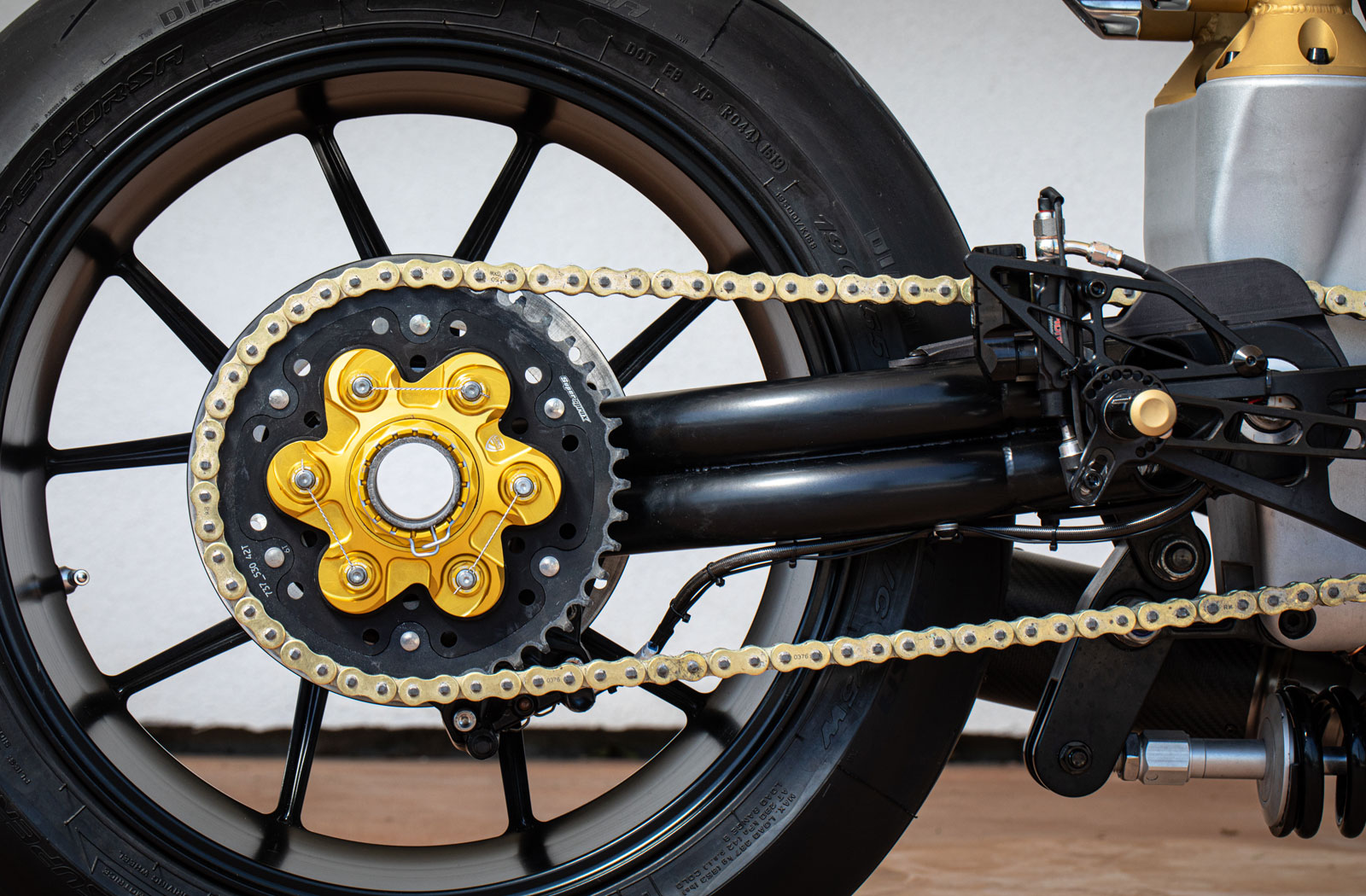 For the front-end brake and suspension, Jimmy secured parts from a Ducati 1198 donor. The setup includes the 1198 forks, twin Brembo brake assembly and a Marchesini 17-inch wheel. The rear wheel is of 1098 Marchesini lineage too, designed to suit a single-sided swingarm setup and it wears more Brembo hardware.