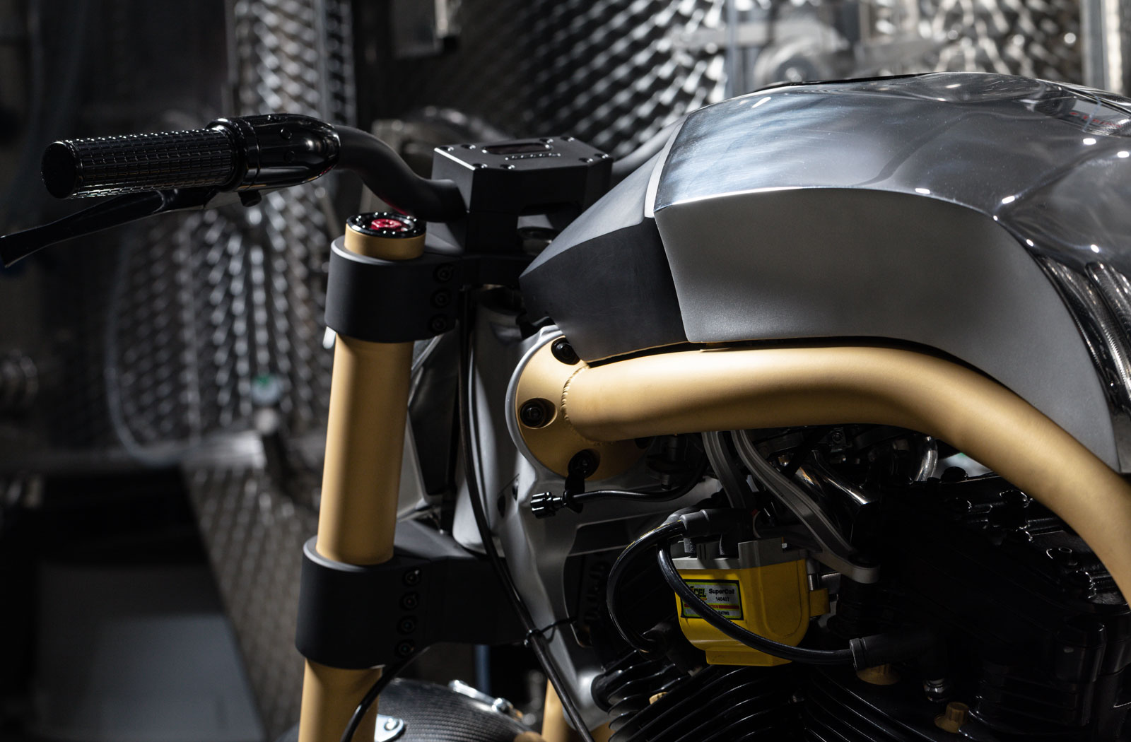 The use of aluminium continued with the construction of the all-alloy bodywork. Sitting atop the broad backbone of the frame is an airbox/fuel tank combo that’s been hand fabricated by Cedric from CRM. The wasp-like tail unit is another handmade part and it features winglet-style spoilers on either side of the saddle. Despite the svelte proportions of the tail unit and subframe, Jimmy managed to stash the bike’s battery and Motogadget M.Unit electronics controller within it along with some integrated rear-end lighting.