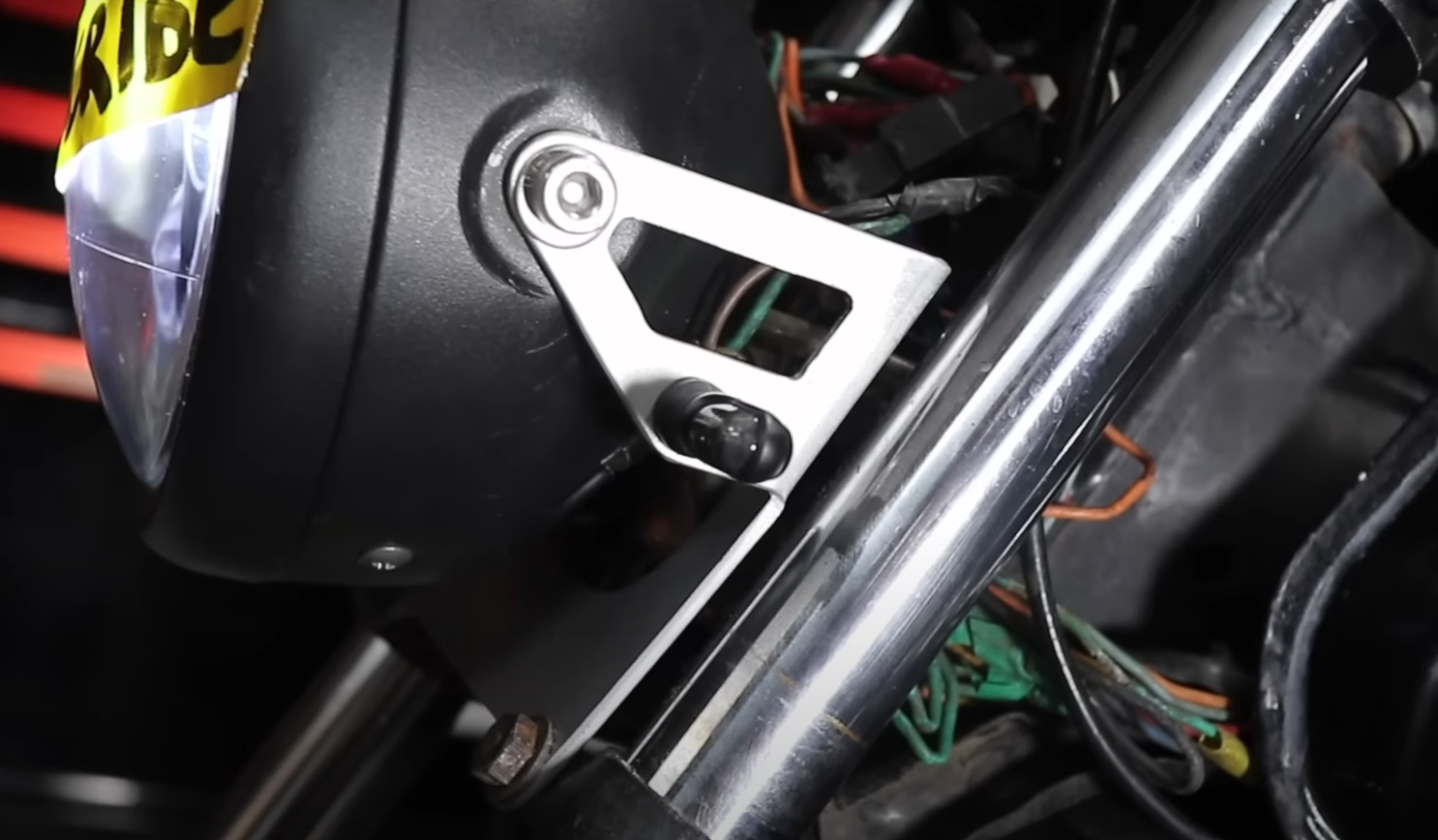 He designed a simple bracket made from flat steel to hold the headlight securely. His first idea involved stainless fittings and a connecting bar, but he switched to a single-piece design that was easier to make at home.