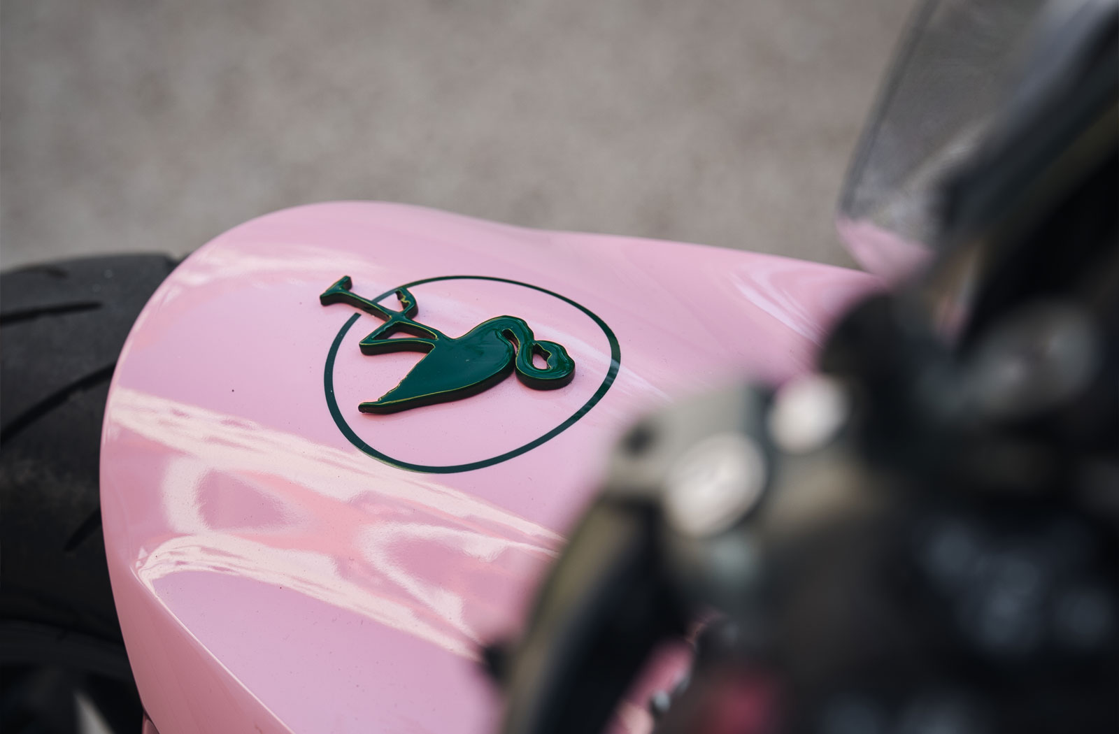 The paintwork is primarily pink with green palm fronds and branding breaking it up. Since Helmade specializes in painting helmets, this bike has been paired with a one-of-a-kind brain bucket. “The concept was completed using a custom Bell Bullitt,” says Möhring. “It’s a tribute to one of Bell’s first Formula 1 racing helmets, the Bell Star XF GP. The visor was individually manufactured out of full carbon and worked into the helmet paintwork. It was good to expose our concept to the motorcycle community and to see their reactions. This concept is made to love or hate.”