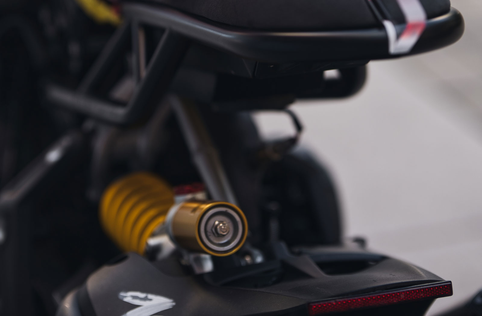 The Roadster handlebars have been replaced with clip-on items wearing aftermarket grips, CNC machined bar ends, and custom fluid reservoirs. The foot controls are new too, positioned farther back and higher to establish an aggressive riding position. Although it’s unlikely to be spending much time on the street the bike also wears Motogadget mirrors and turn signals. You’ll also find a carbon fiber mount for the stock gauge cluster and a set of wheel covers for the rear end.