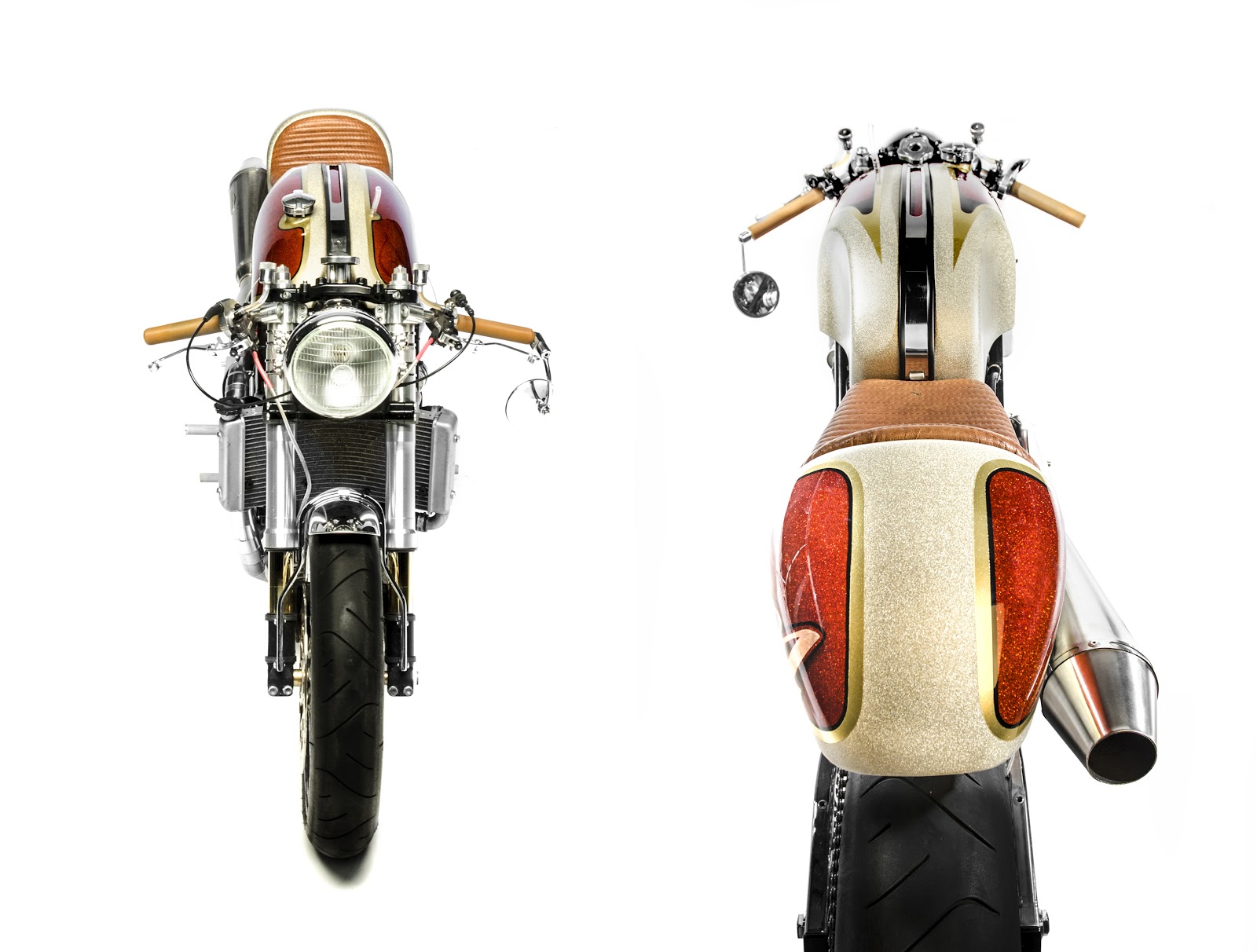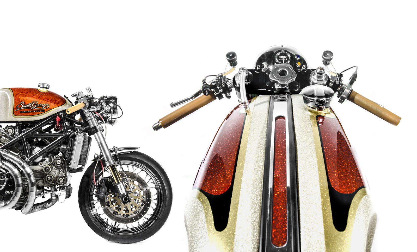 Handling has also been addressed by fitting a set of Showa upside-down forks to the front end and a pair of progressive Sachs to the rear which is all fully adjustable to suit the drivers riding style. Other aesthetic and performance modifications to the Ducati include a Lucas style headlight, Tarozzi rear sets, custom made brake and clutch reservoirs, custom made aluminium front fender and the ribbed brown leather saddle. As with other South Garage builds the Kelevra’s paintwork is an absolute work of art. Completed by Ivan Design it’s an orange/gold metal flake over a base of matte sand yellow. The Kelevra script was hand-laid by Ivan along with the copper leaf South Garage branding.