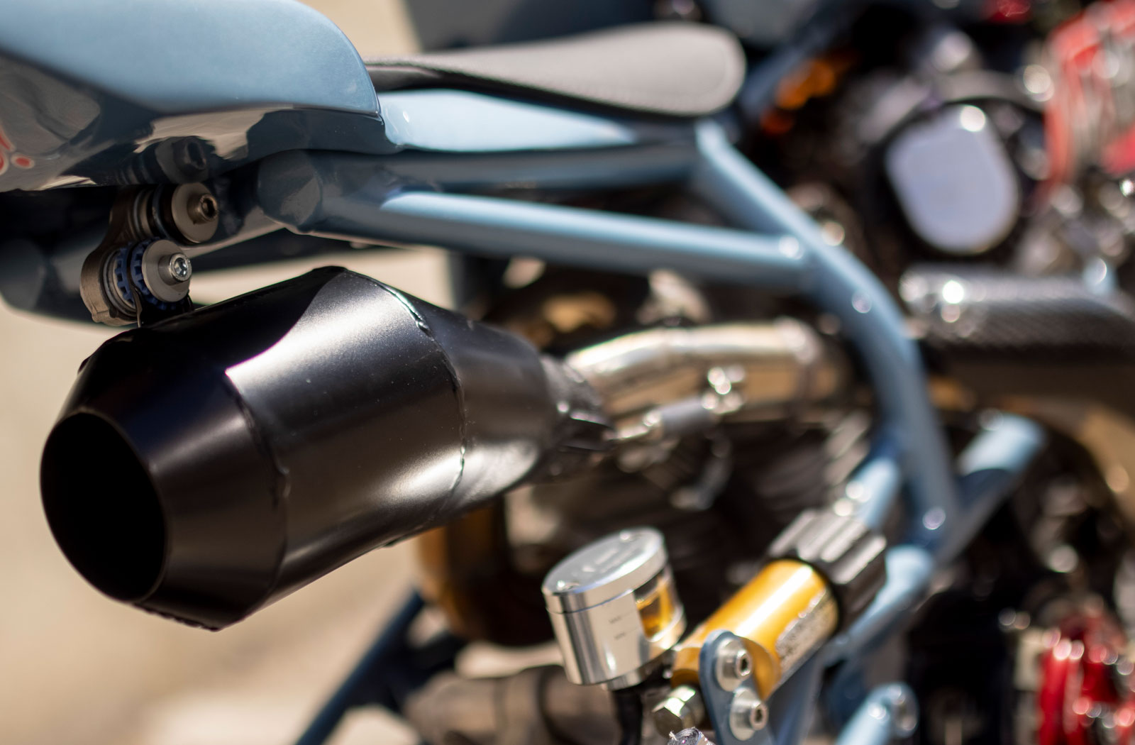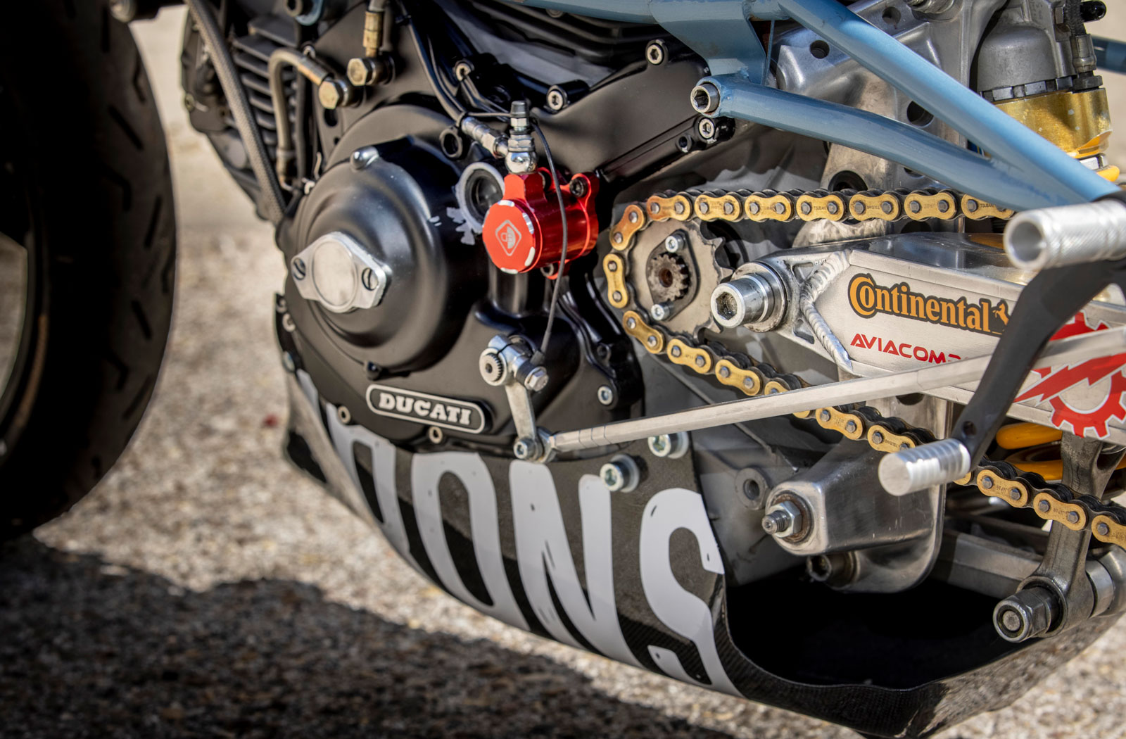 Hidden within the cases of his Elefant engine are high compression pistons, ported heads and a lightened flywheel. Protruding from the side of the gearbox you’ll spot a Ducabike slipper clutch kit which has been combined with a quick shift kit for lightning-fast, clutch pull free gear changes. Electronic fueling has been dispensed with in favour of a Keihin FCR 39 carburettor which is managed by a fully programmable Silent Hetkit ignition kit. A DNA air filter keeps the intake clean and there’s a custom 2-into-1 Wolfman system performing exhaust duties. In an attempt to keep operating temperatures in check while the engine is pushed to its limit Pepo has also added an RC Racing oil cooler.