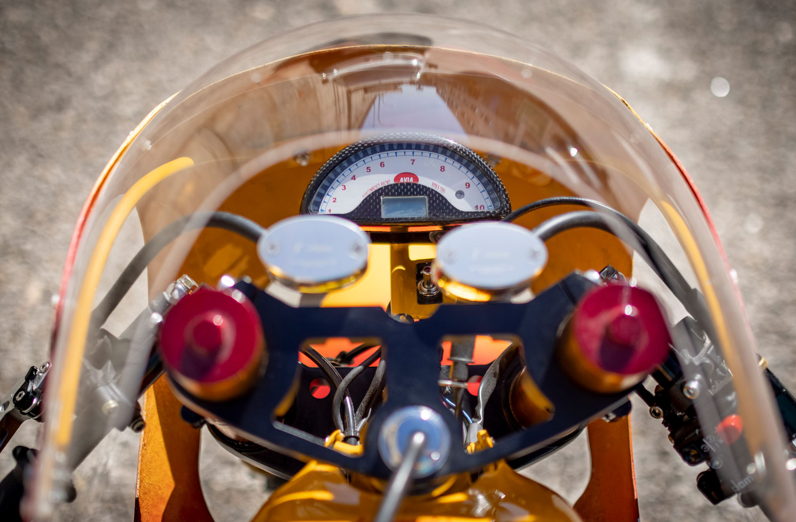 From the pilot’s seat, the view is beautifully simple. Sitting behind a pair of symmetrically mounted Rizoma reservoirs lives an Aviacompositi gauge that relays engine revs to the rider. The controls are also pared back using a set of XTR clip-ons wearing XTR levers, Domino grips, a Domino switch block and Domino quick throttle.