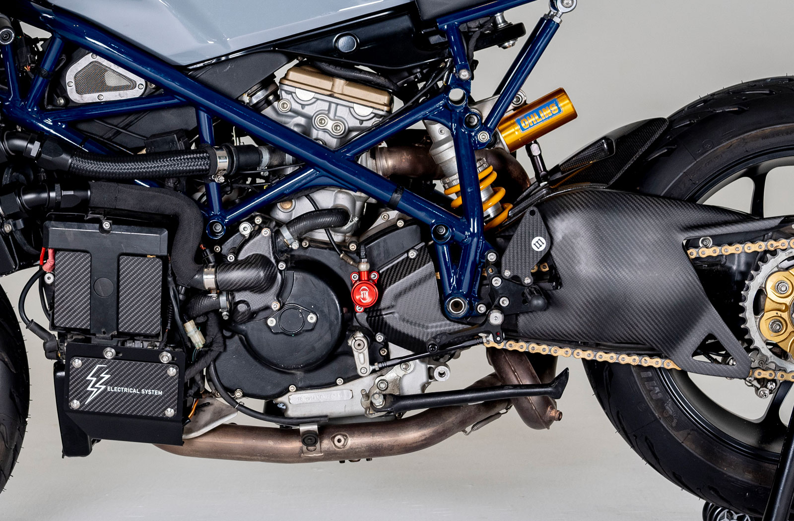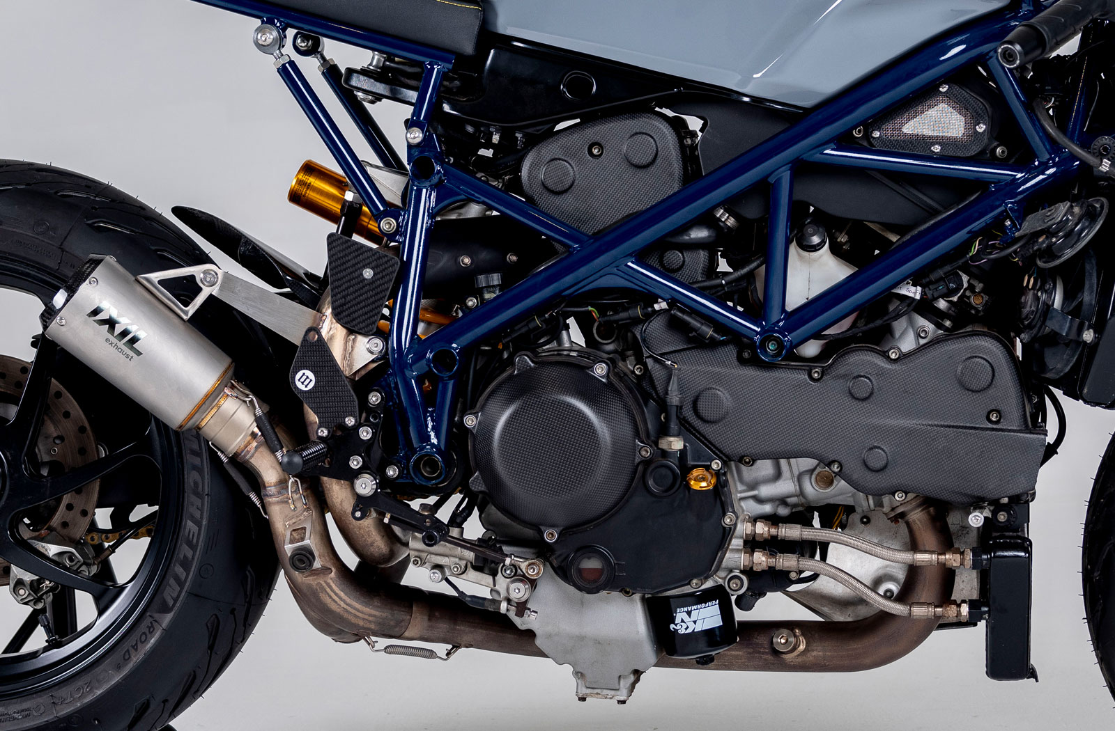 According to Luo this generation of Ducati will almost always have oil leak issues, so this bike’s lubrication system has been completely rebuilt. The rest of the engine has also undergone a full service to grt it running like new. Despite their donor’s shortcomings it also came with a few bonuses in the form of a race-spec ECU and oxygen sensor block-off. So all that was needed to unlock additional power was an IXIL performance exhaust and a remap. As a styling consideration, Mandrill mounted the new exhaust to better suit the project’s cafe racer theme.