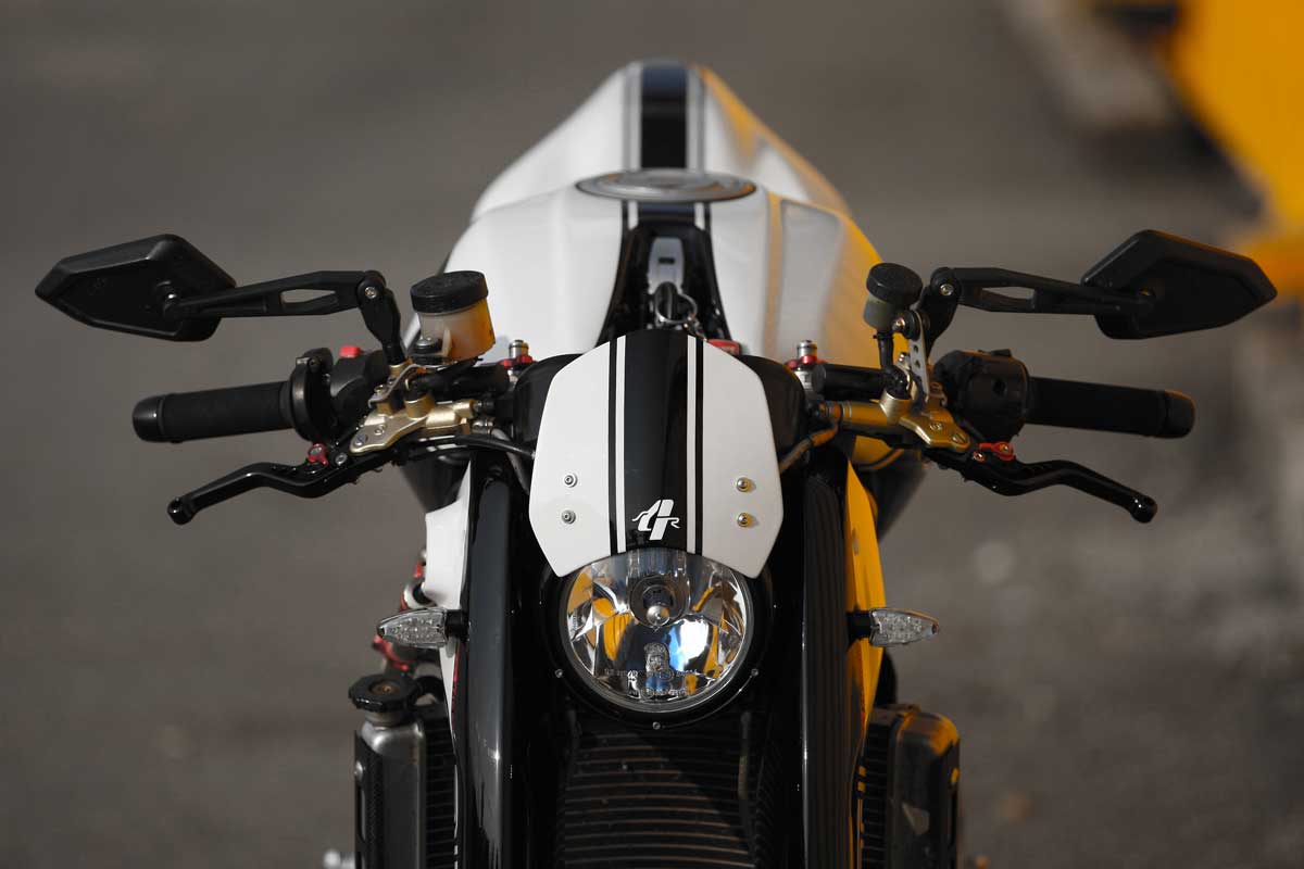 When building his own M-S4R Paolo made several other design choices to get his bike looking exactly how he wanted. To free up the tail section the factory twin side pipes have been replaced by an underslung QD EX Box exhaust. The Euro 3 compliant system increases performance as well as lowering the bike’s centre of gravity. Most importantly though it helps to tighten the Monster’s proportions by visually pulling the engine and rear wheel together. To keep the Monster looking svelte the stock indicators have been replaced by slimline LED units and there’s an LED brake light recessed into the tail. Meanwhile, up front the standard Monster S4R headlight is gone, in its place is an MH900 unit and the stock handlebars replaced with clip-ons. To drop as much weight as possible Paolo’s also installed a plethora of carbon fibre covers and machined performance parts to his Monsters engine.