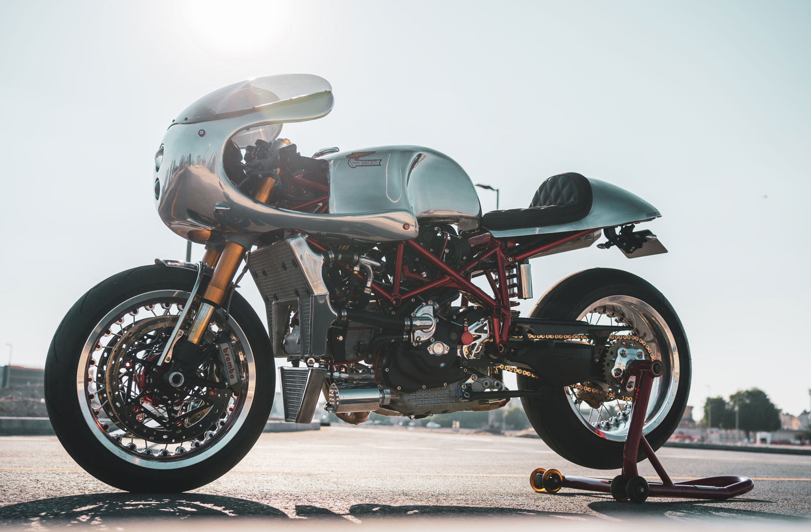“I’d just started the restoration of a 1997 Ducati 916 SPS, and it was agreed that it would be a great, and very unlikely, base for a track-focused cafe racer project. So with the 916 SPS in bits, an old tank was modified with expanding foam and body filler to form a mould for a newly designed tank to be made from alloy. Once that was shipped off to the UK, it was time to source everything else…including a bike!” he recalls.