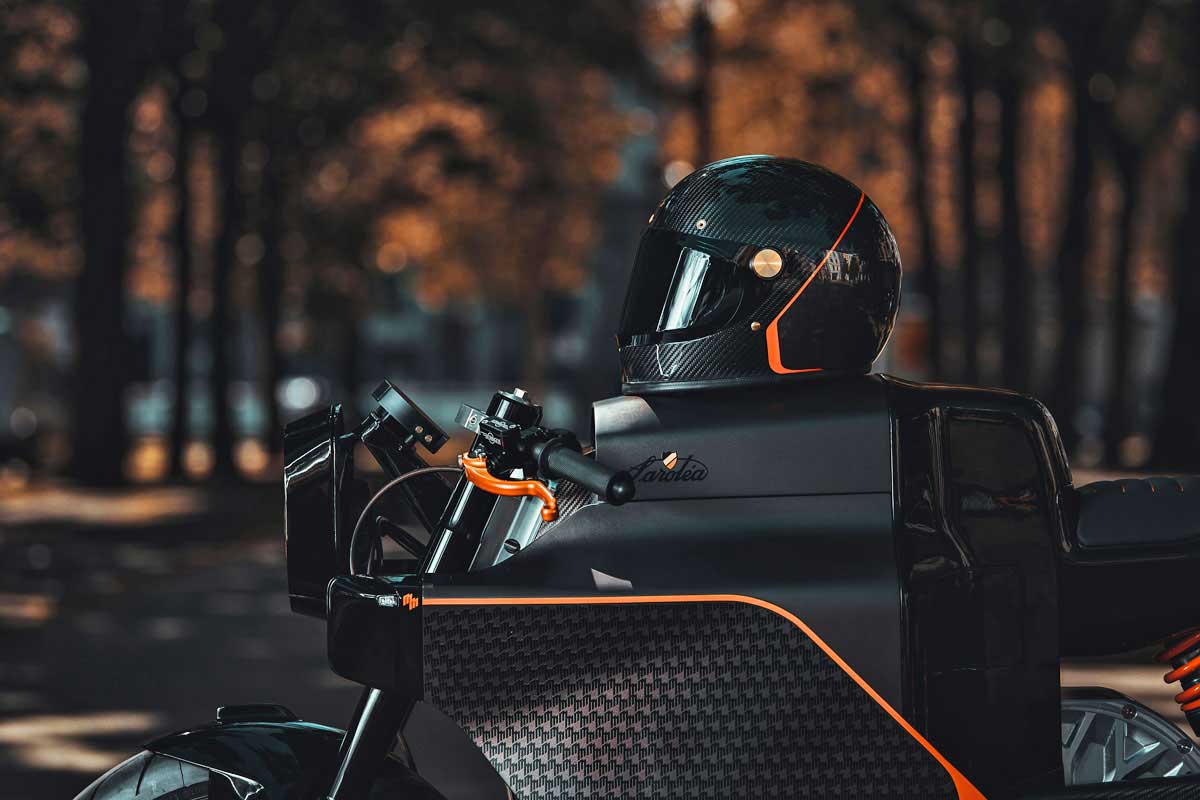During the development of the N60 Mighty Machines also teamed up with 3 other brands. Each of these companies have also produced bespoke products. These are all included in the purchase price of the bike to offer buyers a complete N60 owners package. These include a specially made carbon fibre heroine helmet by Hedon. A Damascus steel knife by Studio Blade and a business styled “bike suit” with integrated armour by Café Costume.