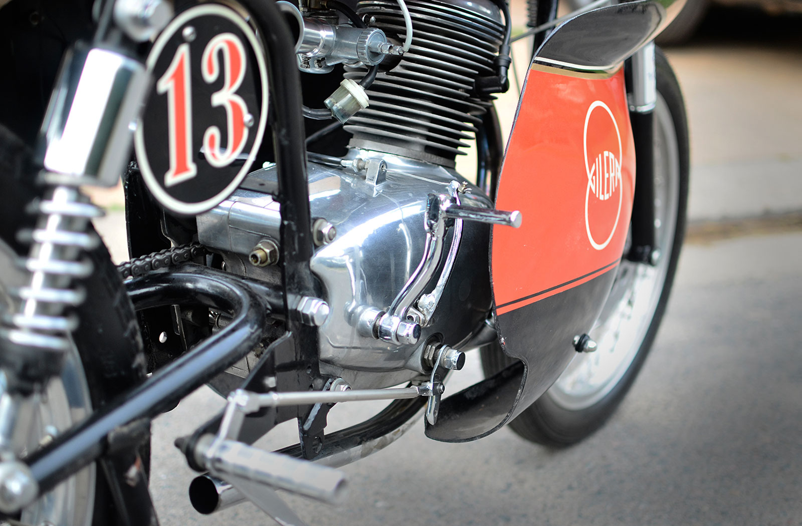 Gabriel’s high spec parts list includes an alloy cylinder head cast from original Gilera engine moulds and bored to 175cc. He’s combined this with a specially made racing cam and an aluminium head fitted with larger valves. The 18mm stock carb has also been replaced by a larger 24mm race unit and the gearbox houses lightened internals. Not surprisingly the complete list of modifications is too long to list and almost too hard to remember, but what really counts here is how effective they have been.