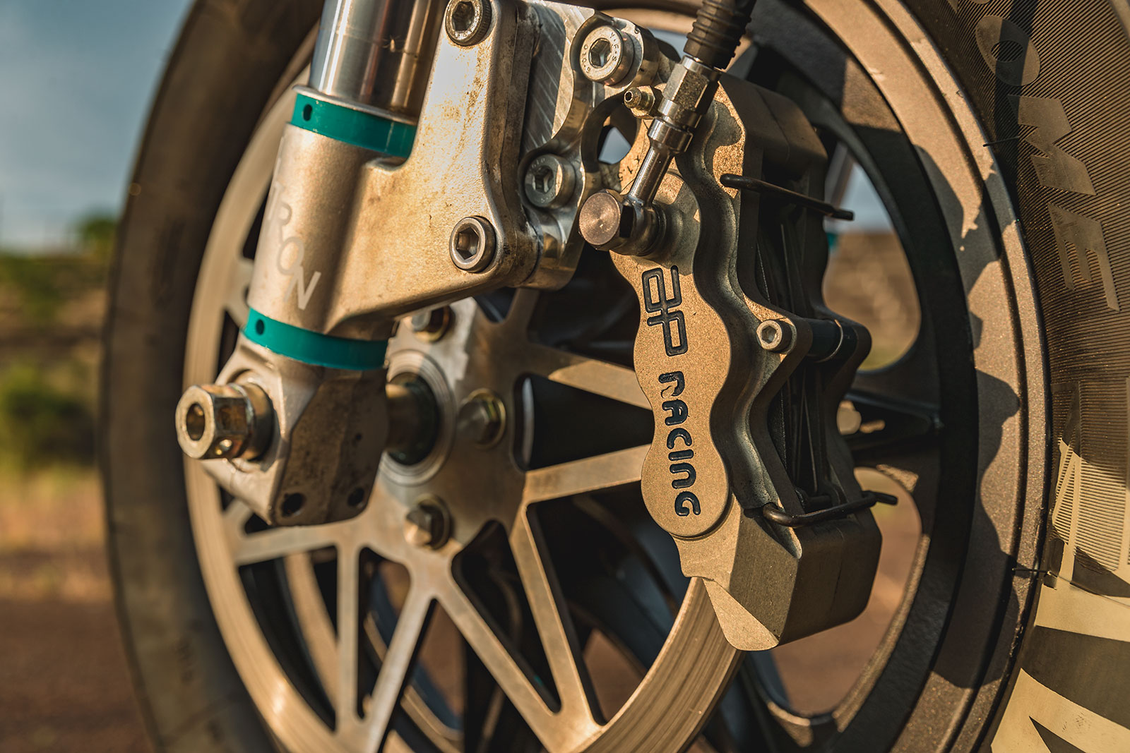 Stopping power upgrades come in the form of AP Racing callipers that bite down on EBC rotors. To keep the front end looking clean the Icon team cleverly machined a custom front brake rotor that mimics the spoke pattern of the wheel.