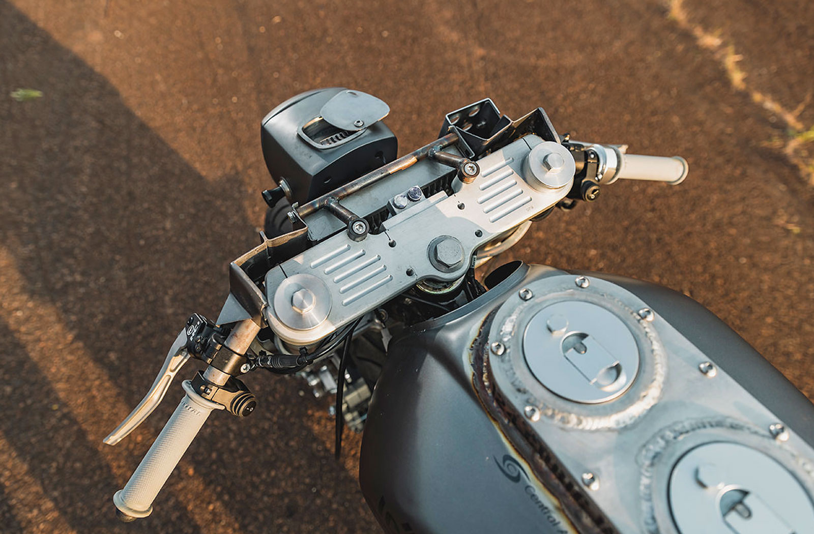 Nestled behind the Honda headlamp sits an additional oil cooler that’s flanked by a set of clip-on handlebars. The bars are wearing Magura HC1 levers and Renthal grips. The striking simplicity of the revised cockpit was made possible by the fact that Icon has no intention of running this bike on the street.