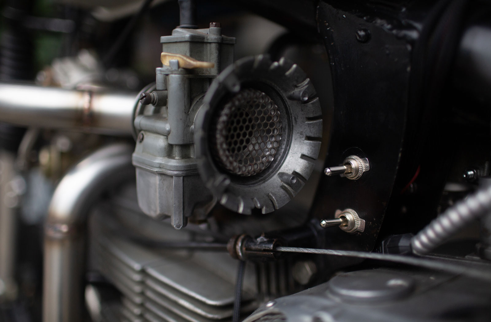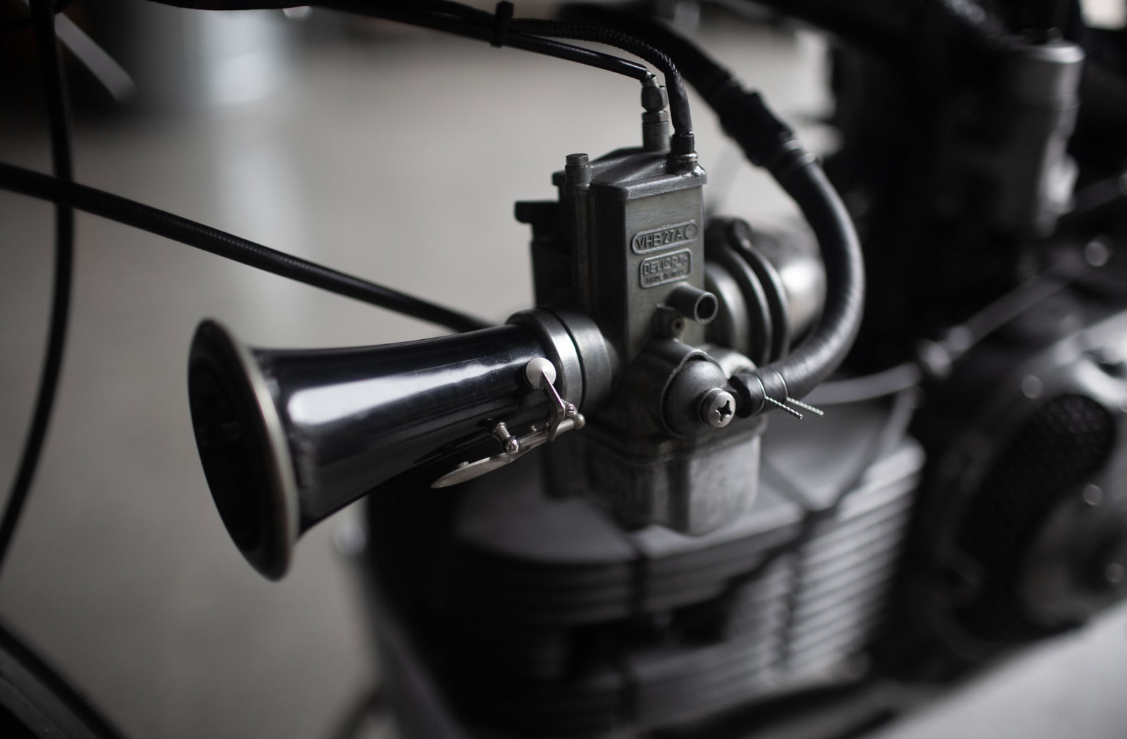 There’s no shortage of curious design touches on either of these bikes. Closer inspection of either one will reveal repurposed components from musical instruments, old telephones, agricultural machinery and secondhand leather. Some have been added purely for aesthetics but most have a dual function. For instance, on the white bike, the air intake on the turbo housing is made using part of a straight soprano saxophone and the black bike has a velocity stack on the carb made from the mouth of a clarinet.