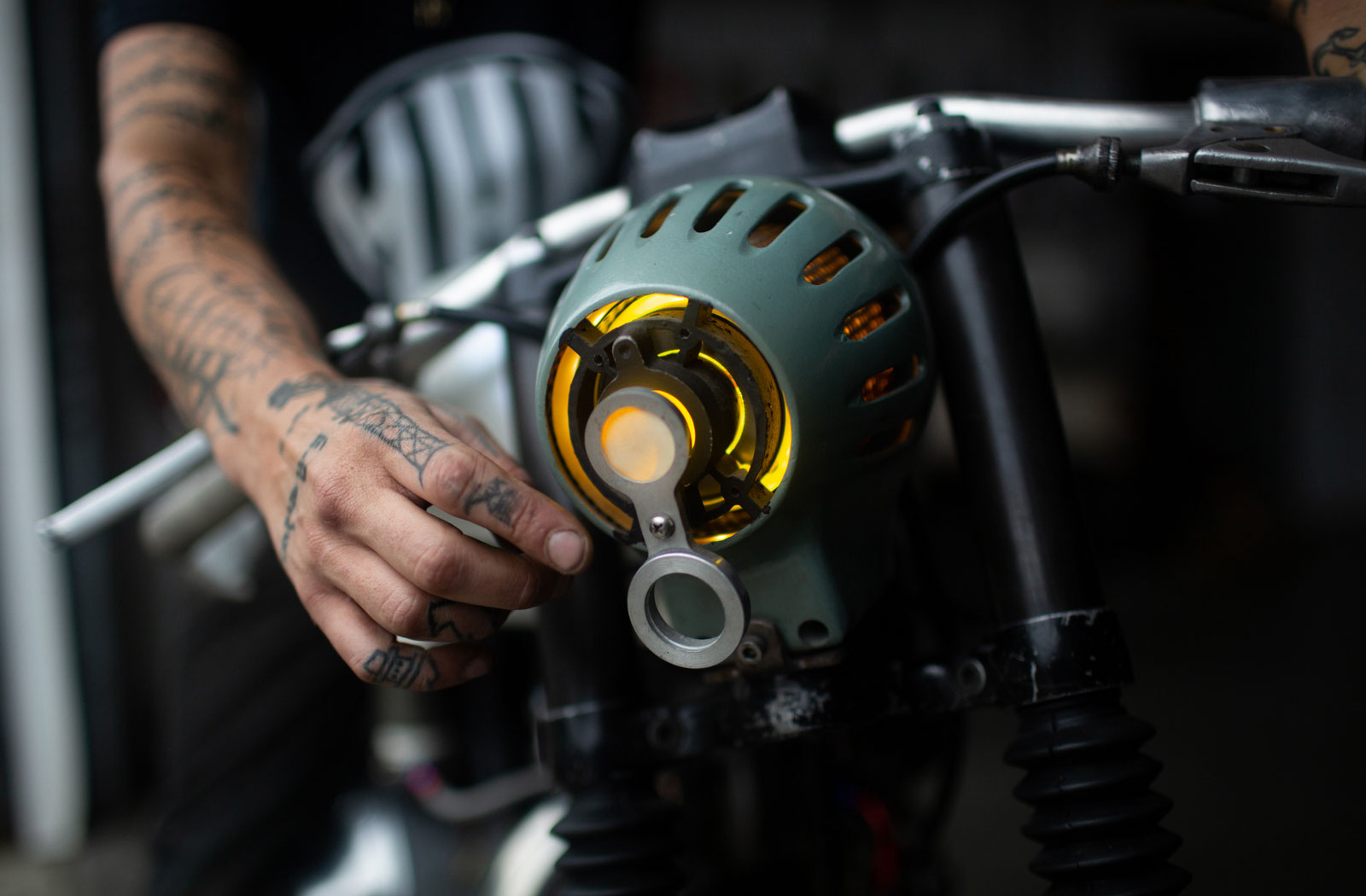 What makes J.Shia’s approach with the wiring unique is a secondary loom that bypasses the coils and battery. This allows each bike to be plugged into a standard 110 power outlet. This means that the headlight can function as a lamp should the owner ever want to park one inside their home.