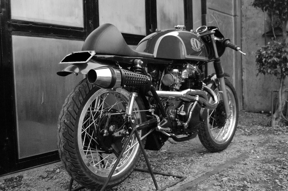 The 2 Cafe Racers seen here are “Pinas 550” (top), a 1973 Honda CB 550 and “El Poquito” (the little one) a 1969 Honda CB350 based Cafe Racer.