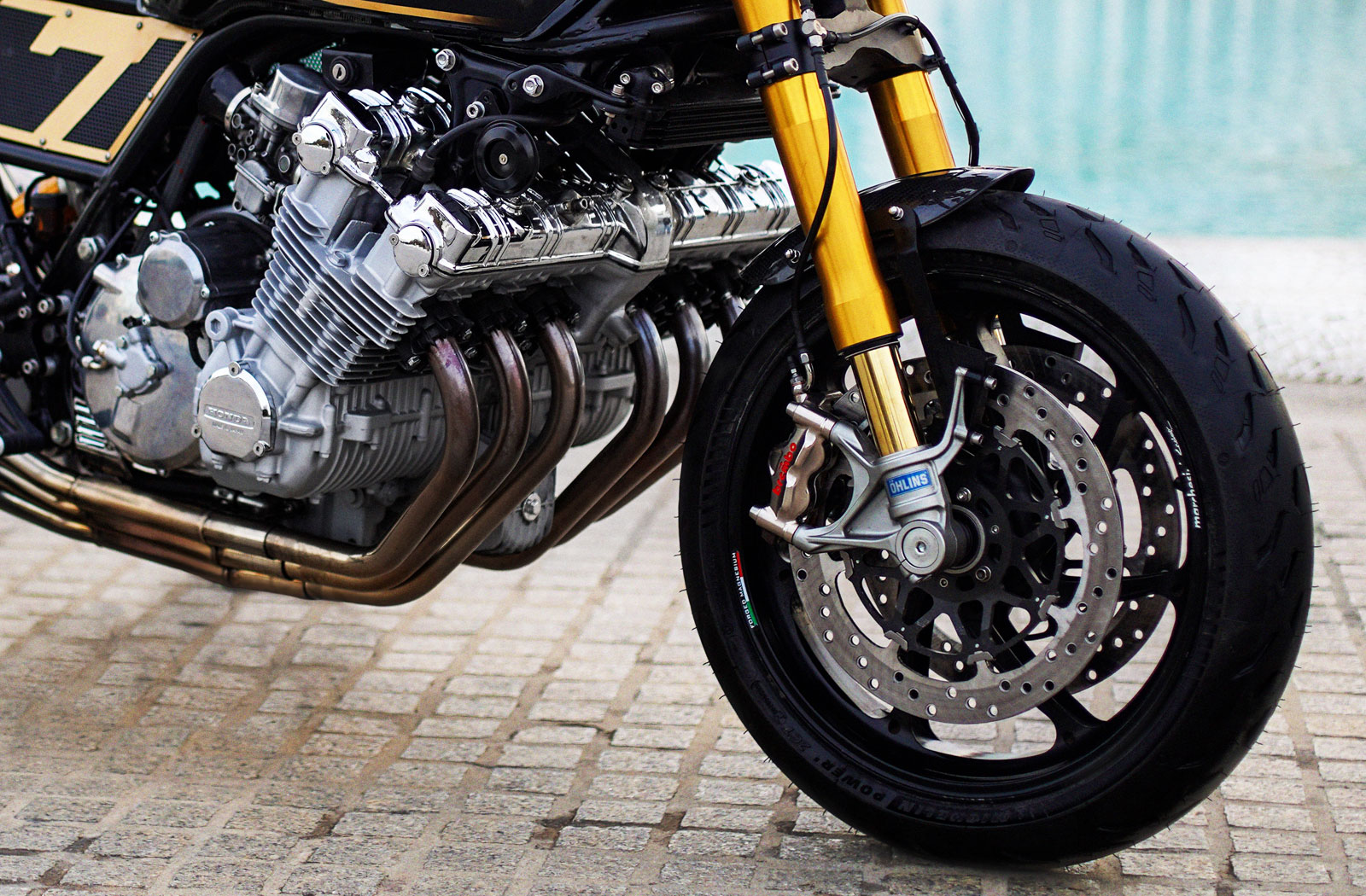 Since Honda first unveiled the CBX1000 to the world in 1978 there have been vast improvements in suspension – and this bike is running some of the best components on the market. Starting with the front end it’s a Moto GP spec set of Öhlins forks that offer full adjustability. In the rear, the modifications were a little more complicated…