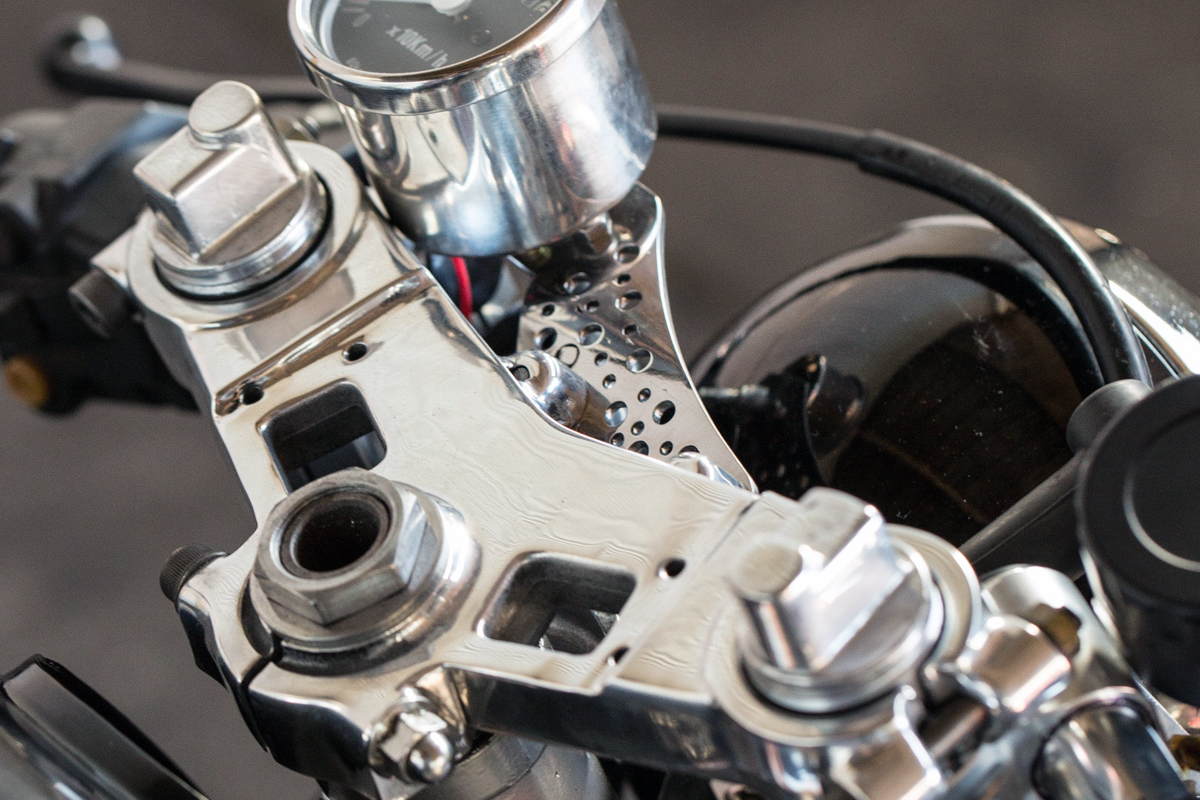 Powering the bike is a custom-made wiring harness running all LED lighting, aside from the headlight, and the wires have been kept out of sight by running them internally in the frame. While the black and silver paint on the bodywork was drying Edi completed the CB900s overhaul by polishing any of the bikes aged alloy components to a mirror finish.
