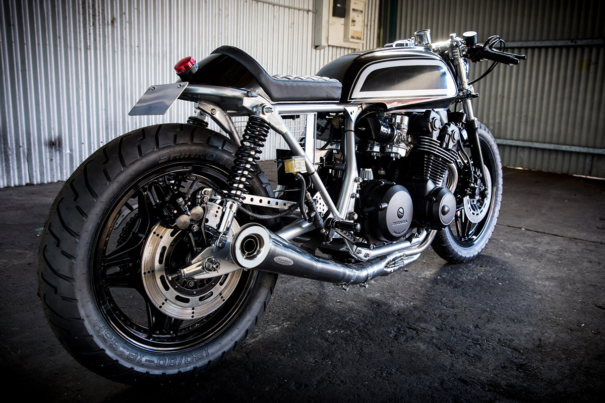 The bikes power gains can be attributed to jet upgrades in the carbs and a 4-into-1 Delkevic exhaust system. To get the CB sitting and handling right the forks were rebuilt and lowered and a set of shorter shocks installed in the rear. Stopping power was also improved using a CBR600 rear master cylinder.