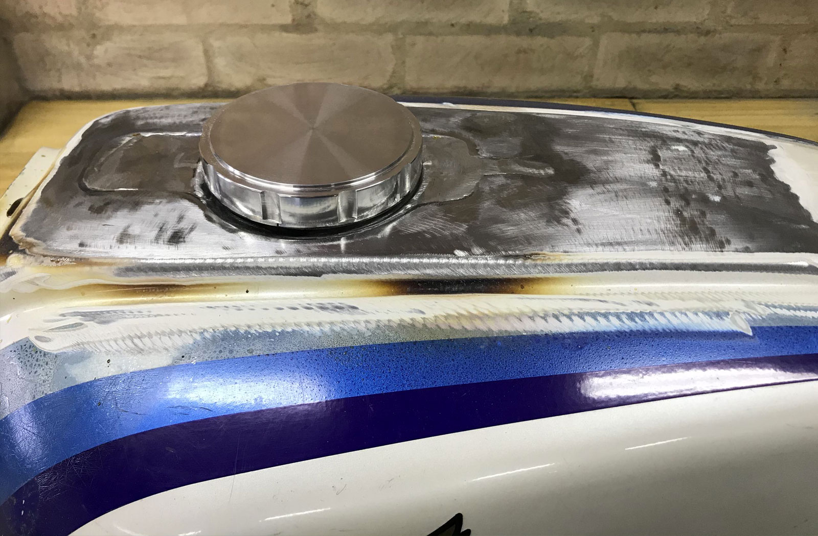 The fuel tank originally had a jerry can style cap and locking mechanism which I never really fancied. The indents were filled with solder and I had a new custom cap made up for a clean classic look. I also relocated the battery, rectifier/regulator, spark units and solenoids to the seat pan.