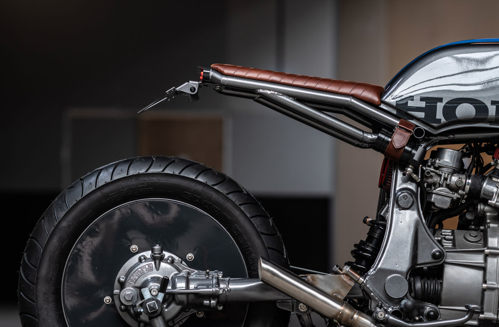 The forks Ironwood picked out for the GL500 is a Ducati Monster 1200 item. It’s fitted to the bike using the custom top clamp and still bears the Ducati front wheel and brake assembly. Honda’s Comstar wheels may be iconic, but they didn’t suit this bike’s design brief. Since the stock rear wheel would remain on the bike Arjan fabricated a set of discs to disguise it. In keeping with the aggressive new styling, the wheels are wrapped in Pirelli Sport Demon rubber and to balance out the suspension upgrades the rear shock has been swapped for a TFX alternative.