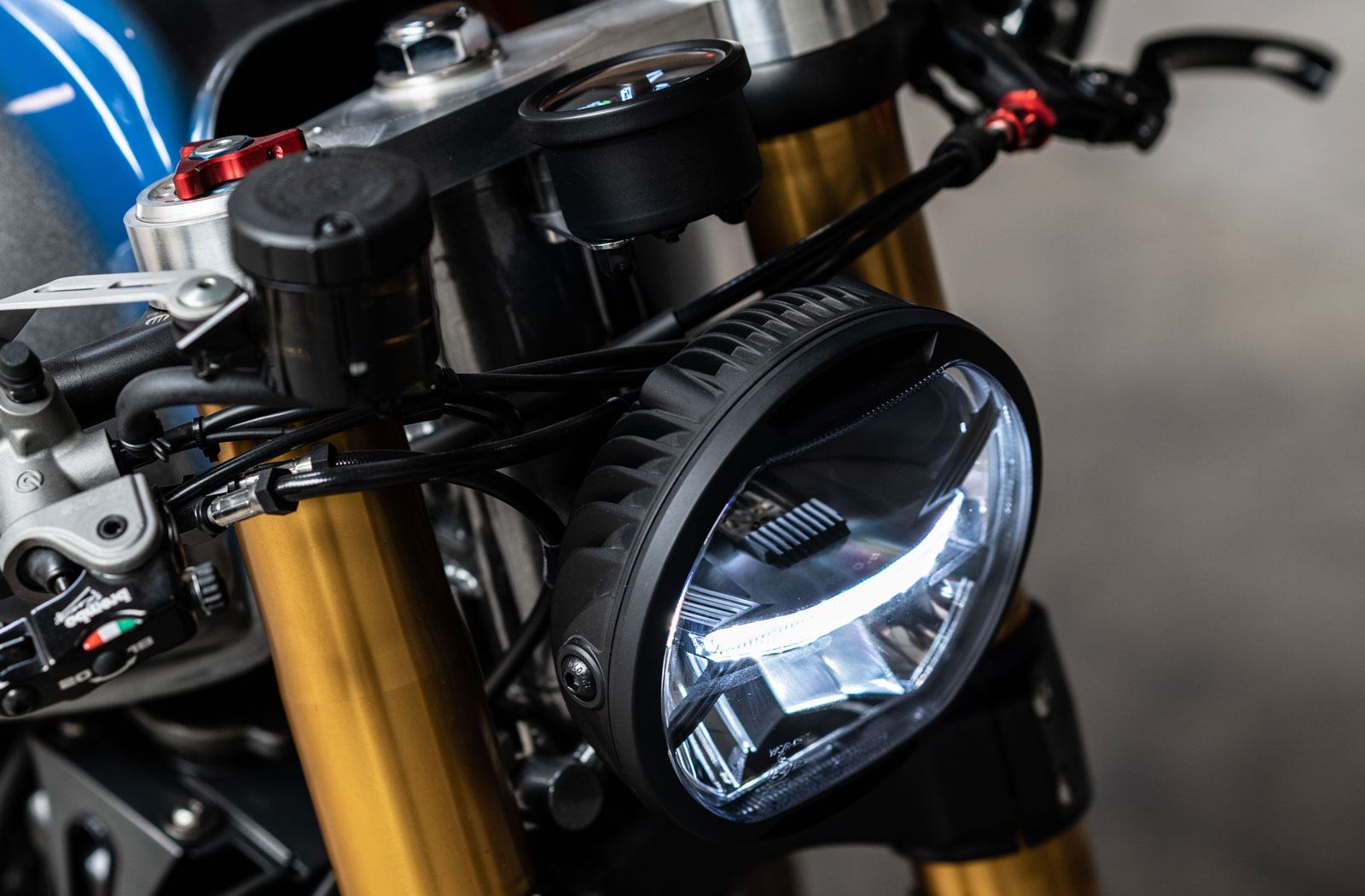 All of the Honda’s lighting now runs on LEDs. Along with the tail lights Ironwood installed Kellerman bar end turn signals while the headlight is a Koso Thunderbolt unit. “The headlight position was challenging,” Arjan admits. “I wanted to have no lamp ears on the fork so I asked my buddy Chiel from Nius Moto to construct something unique.”
