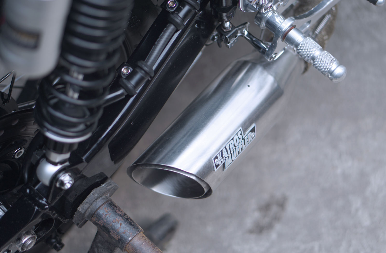 Big performance gains were never the focus of this project so upgrades have been limited to the intake and exhaust. Hanging from the re-tuned carbs are pod filters that allow the inline-four to breathe easily.  The 4-into-2 exhaust is a bespoke system fabricated in-house by the Katros team that finishes with a pair of custom-made Katros mufflers.