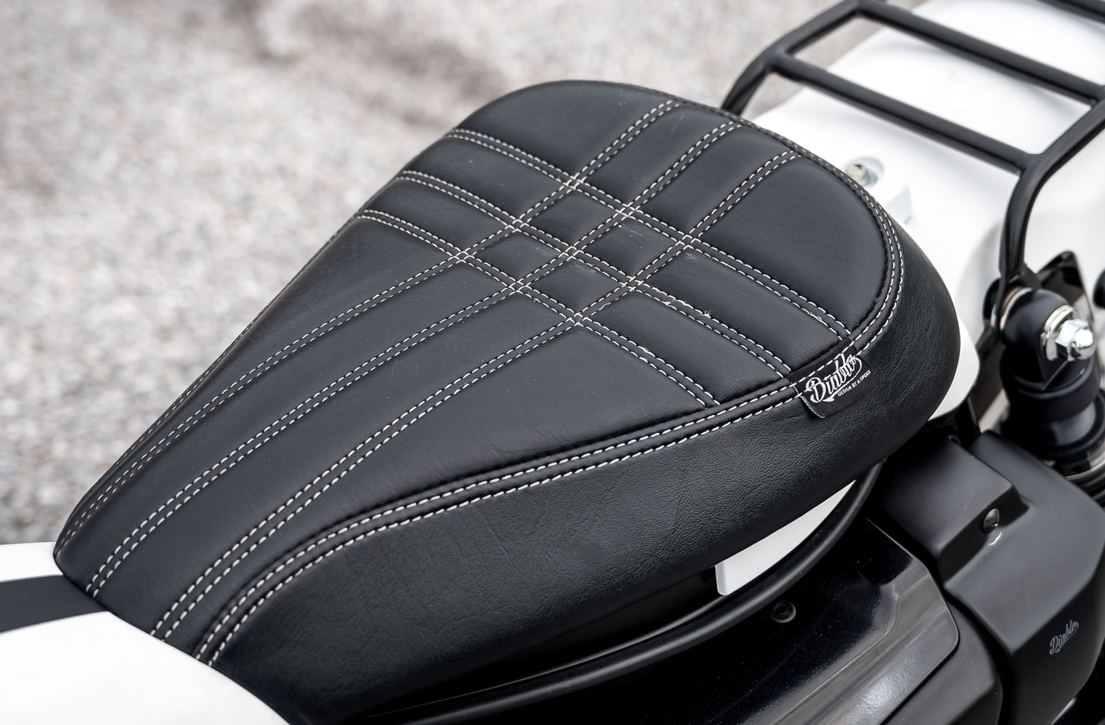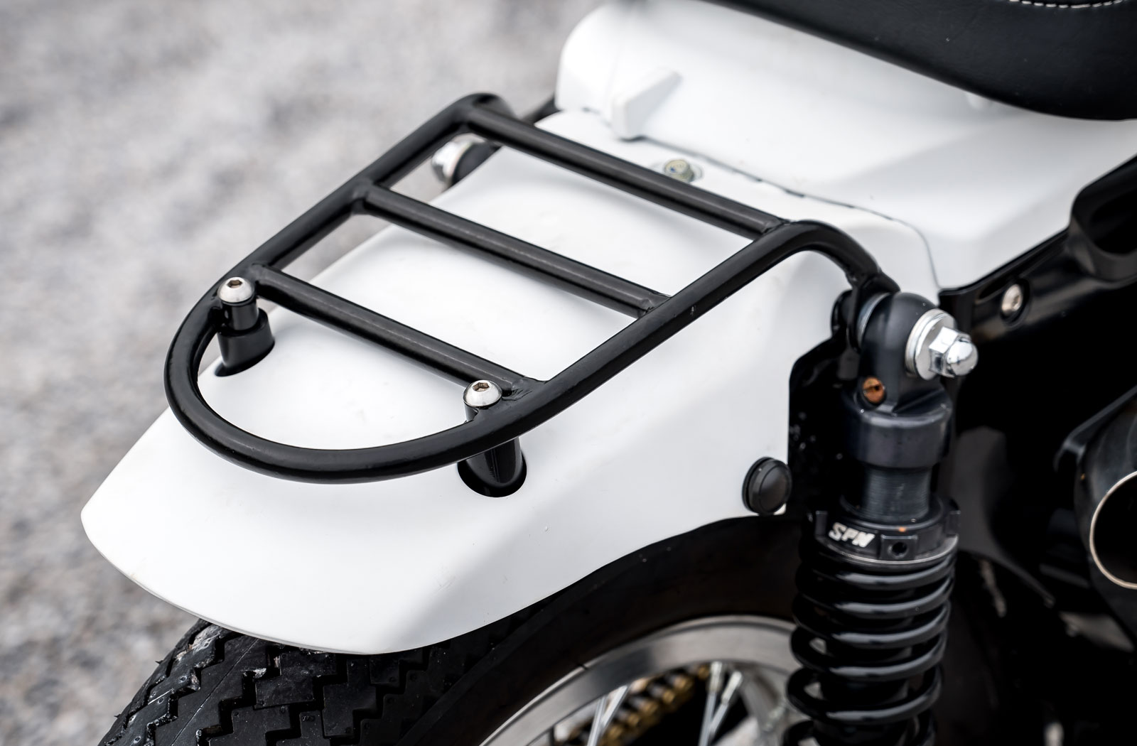 The most dramatic change to the Road Runner is the addition of a Sportster styled fuel tank. Looks are definitely deceiving here because the tank is actually a hollowed-out cover. It fills the step-through space in the frame giving the bike a traditional motorcycle appearance. Beneath it sits a handy frame-mounted rack for stashing a small bag or satchel. Behind the faux tank sits a slimmed-down Diablo seat finished in black leather with contrasting white stitching. Completing the new bodywork arrangement is a small custom rear fender that wears K-Speed’s own take on the Super Cubs rear rack.