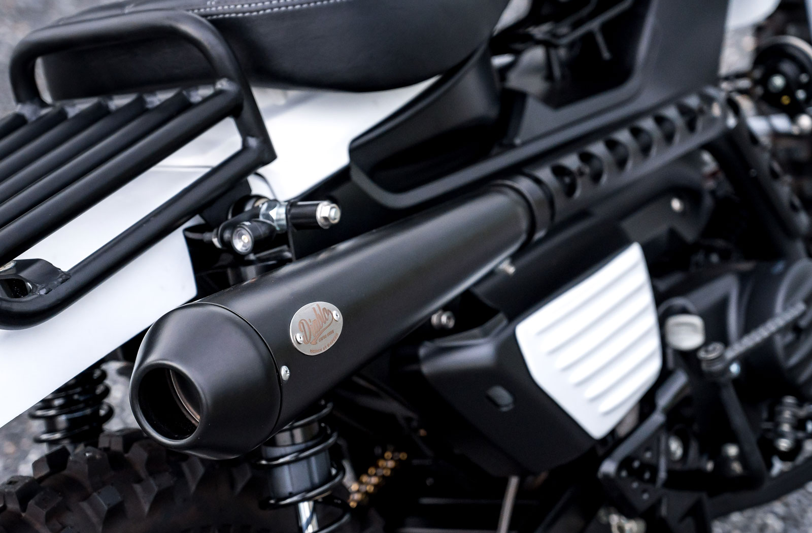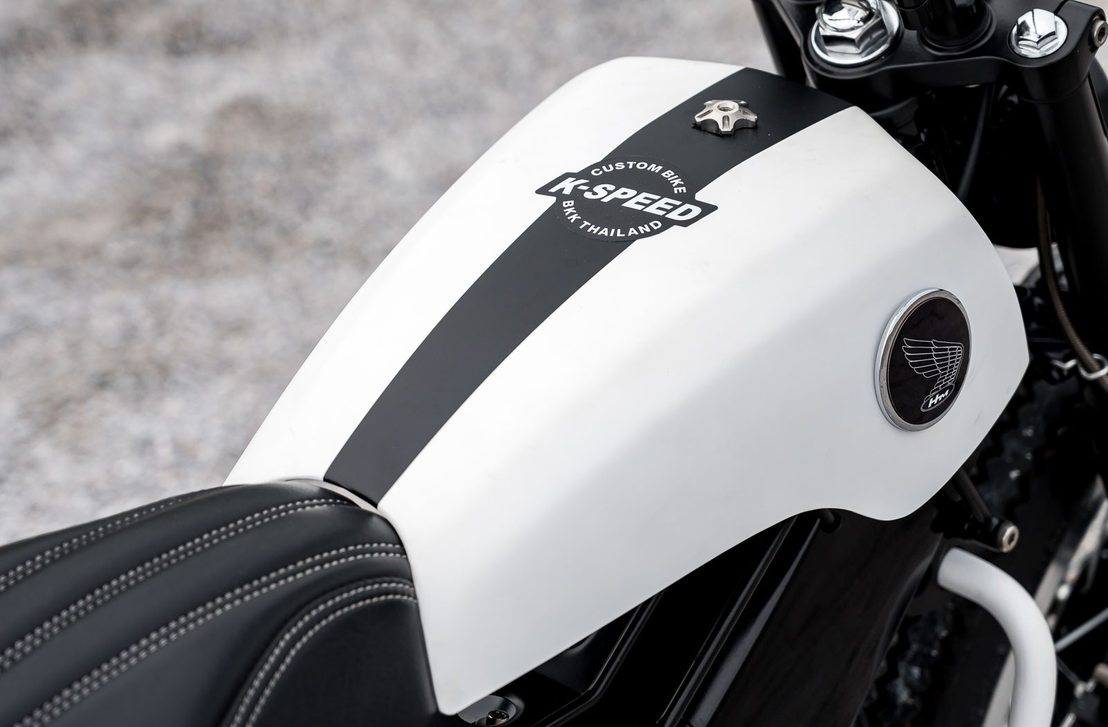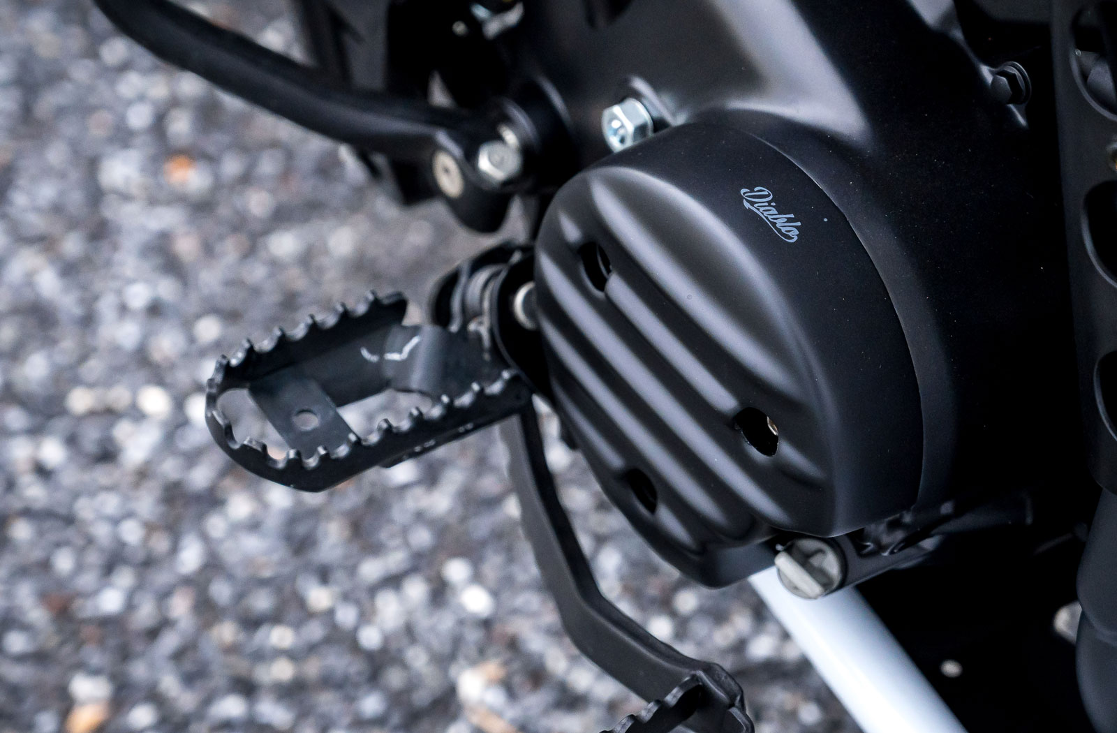 To kick things off each of the Cubs was stripped down to the frame and engine. K-speed dispensed with the stock fenders, wheels, seat, lighting, exhaust, centre stand and swingarm. They then redressed the engines in black and added their own Diablo brand ribbed engine covers. A coat of black was also applied to the frame covers and fuel tank to tie it all together. The Cubs then received White ribbed side covers which set the tone for the pairs matching black and white colour schemes.