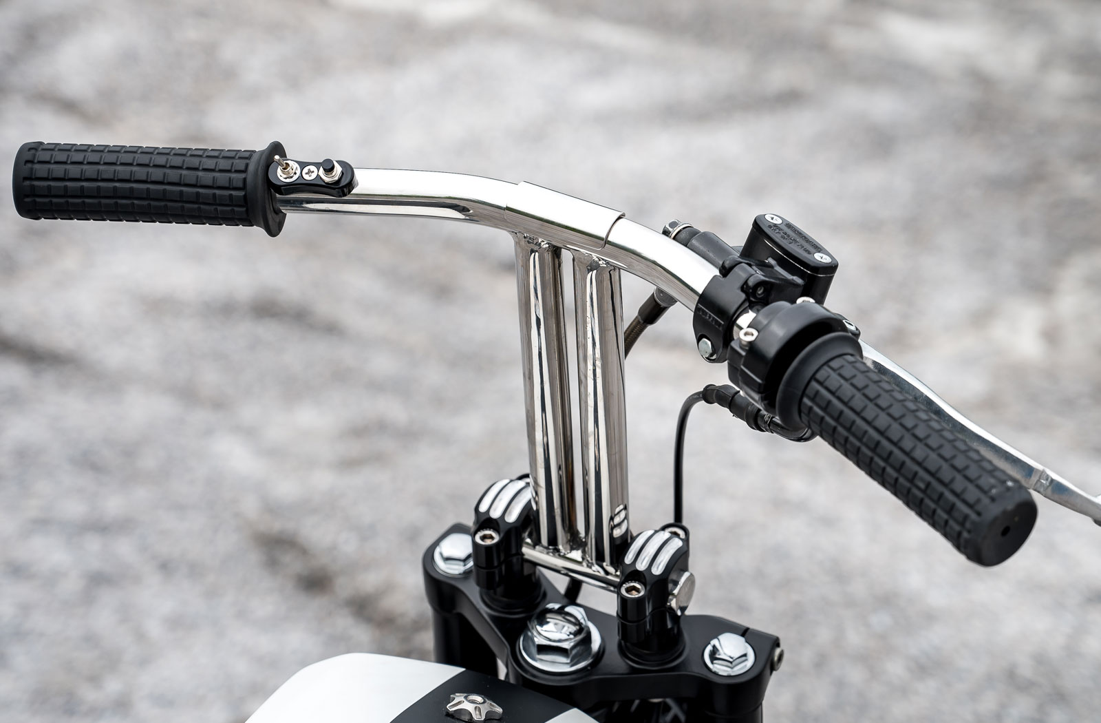 To keep the front end clean K-Speed has shaved the stock headlight supports. The remaining lower brackets hold a small LED headlight that sits snuggly between the stanchions. In typical chopper-style, the handlebars wear nothing more than a single brake lever and throttle and the Honda gauge cluster has been relocated to the left side of the frame.
