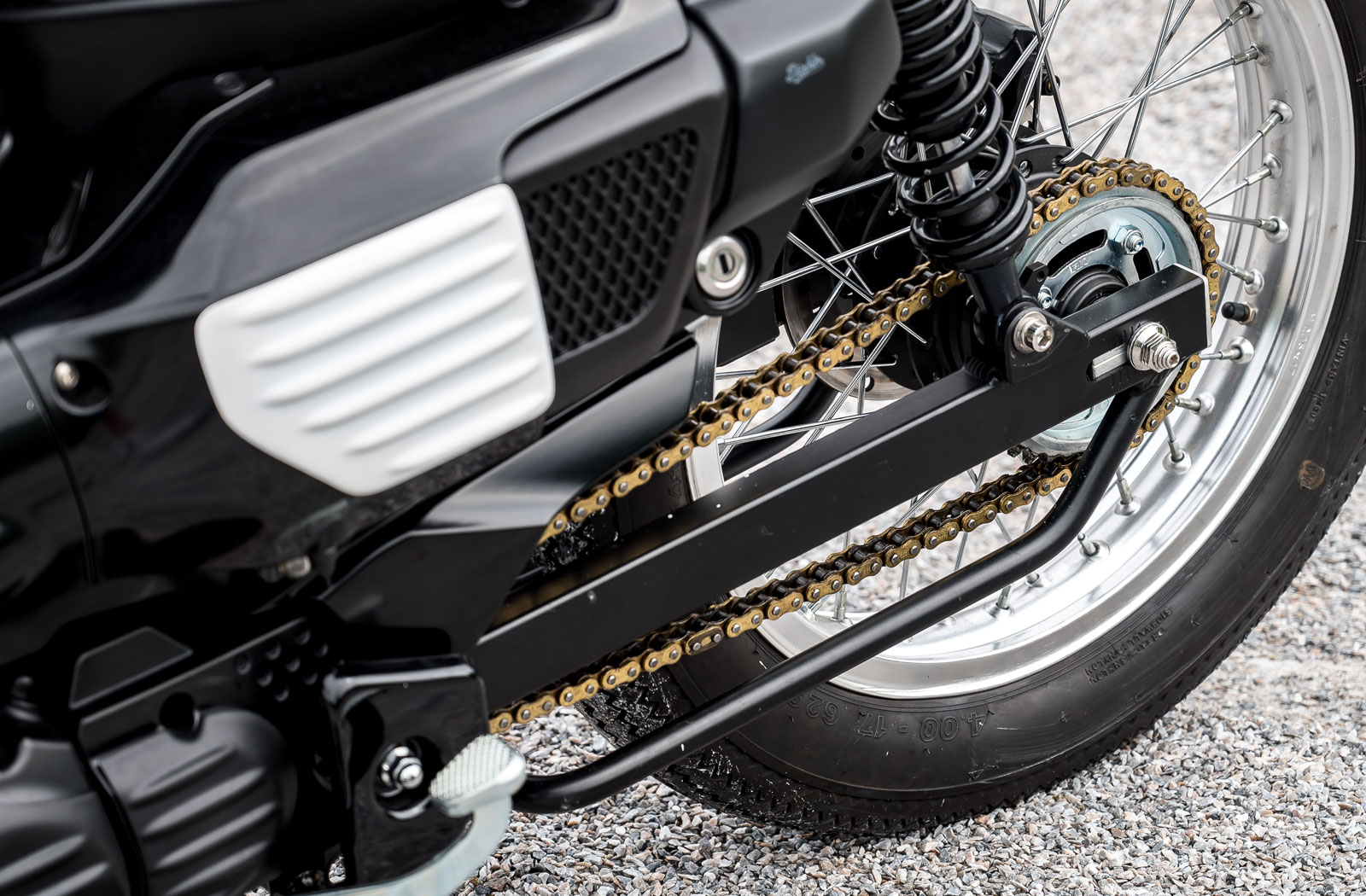 The process began again with some rubber and suspension tweaks. In this instance, the rims are the stock items but they’ve been wrapped in chunky offroad rubber. This Cub’s swingarm has been swapped for an extended K-Speed item too and the shocks are taller aftermarket alternatives that give the rear wheel plenty of room to move.