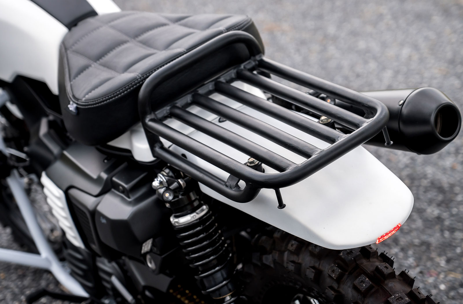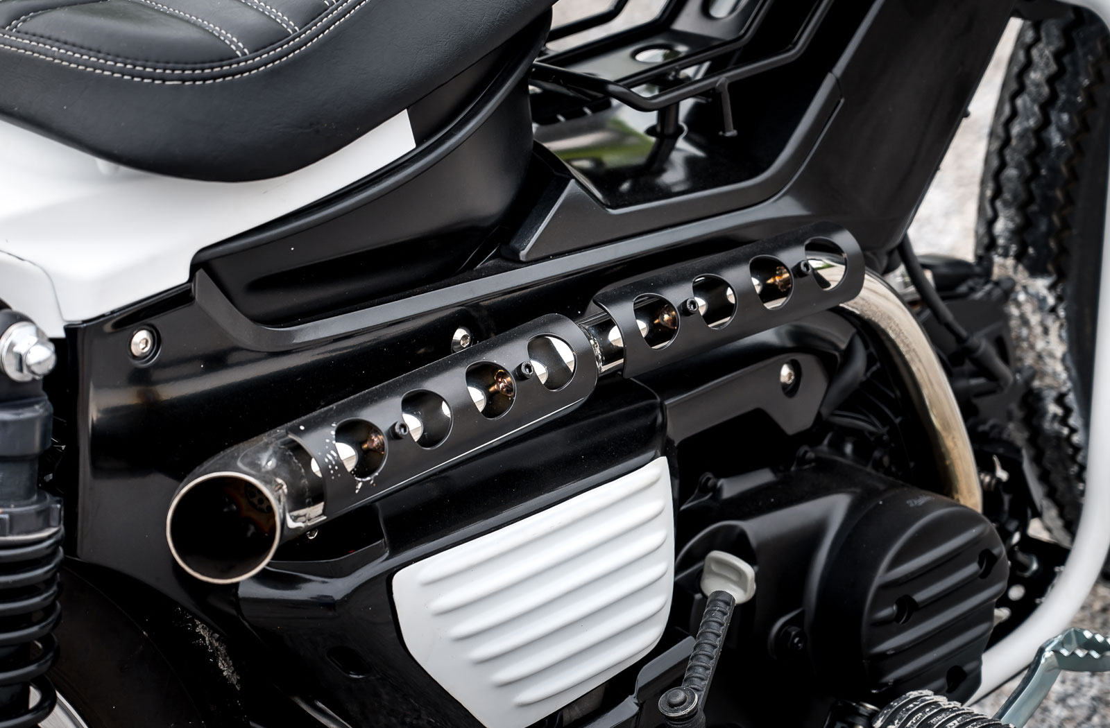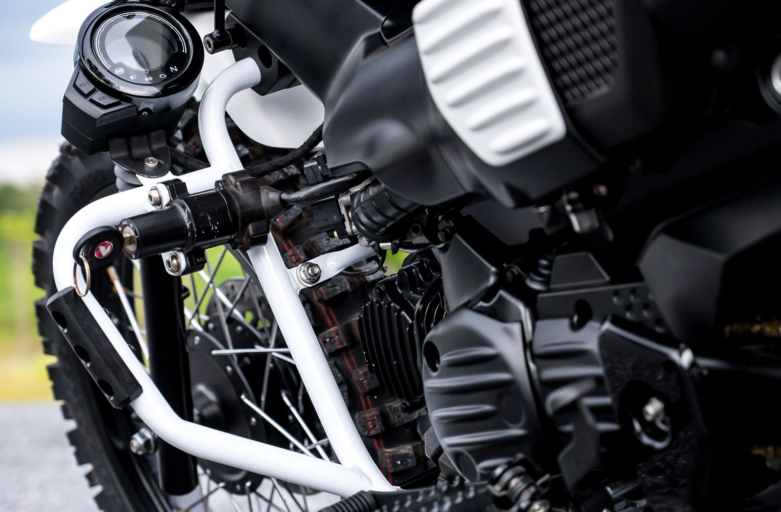 Again the biggest change in appearance to this CT125 comes from the bike’s faux-fuel tank. The shape has been revised to suit the theme and beneath it, you’ll find extra frame-mounted storage. As for the seat, it’s a wider unit better suited to off-road exploits and there’s a custom tail unit sporting a tiny LED brake light. The final off-road upgrade comes in the form of the modified frame rails which have been widened to function as crash bars and fitted with PU Nylon sliders.